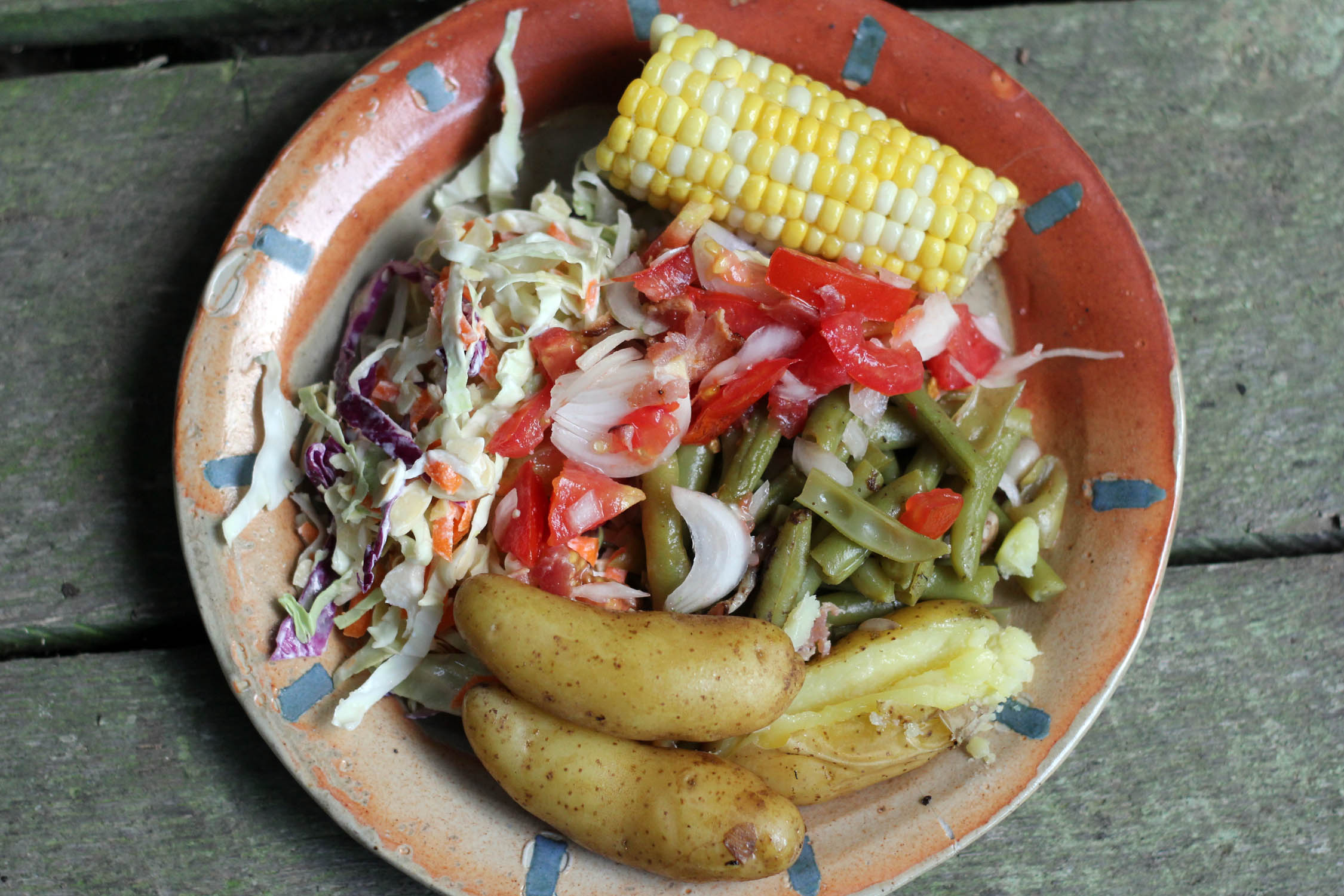 Hold the bean pointy end up. Grab the point and pull it down to the stem end, then grab the stem end and pull the string off the other side. Now snap your bean into about 4 or 5 pieces. DO NOT EVER, NEVER, cut your string beans with a knife! Heavens to Betsy, you will slice up the meaty bean inside and that is just plain awful. Sorry to scold, but sometimes you just have to stand your ground. Now to cook. First fry up a few slices of bacon in a cast iron pan (or saucepan). Then add your beans and cover with water. Simmer about 15 minutes, and see if the beans need any salt. Place whole small fresh-dug potatoes on top and cook 15 more minutes with the lid on. Now toss in some corn on the cob halves and cook another 5 minutes or so until everything’s done. Salt and pepper to taste. Don’t junk up the honest flavors of this summer garden “stew” with fancy schmancy seasonings.