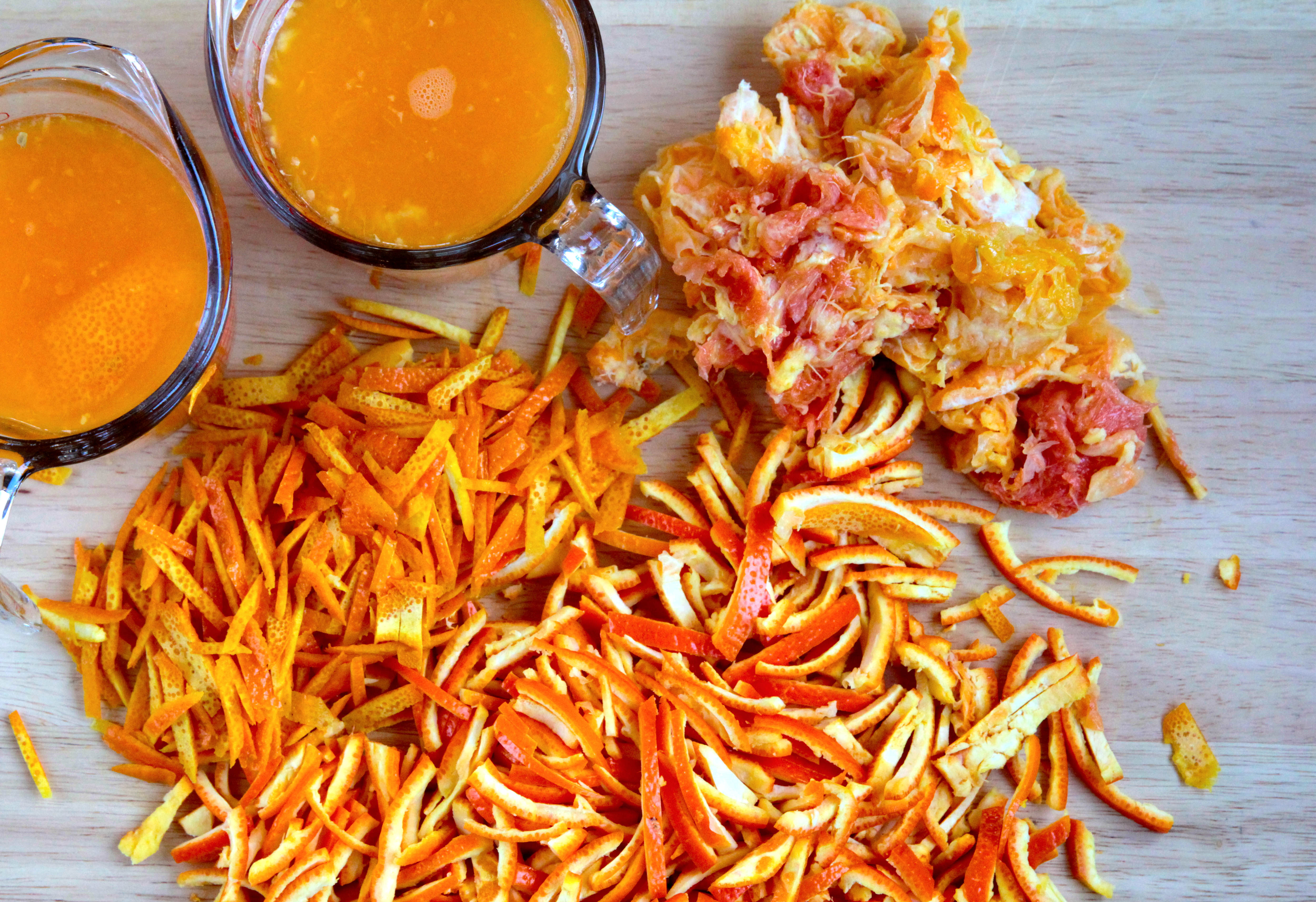 Now, you should have two cups of juice and a pile of rind and one of innards plus seeds. You’ll also juice 4 lemons and save the seeds, but you won’t need the rind or pulpl for this particular jam. (Always save your organic lemon zest in a little jar in the freezer for later!)