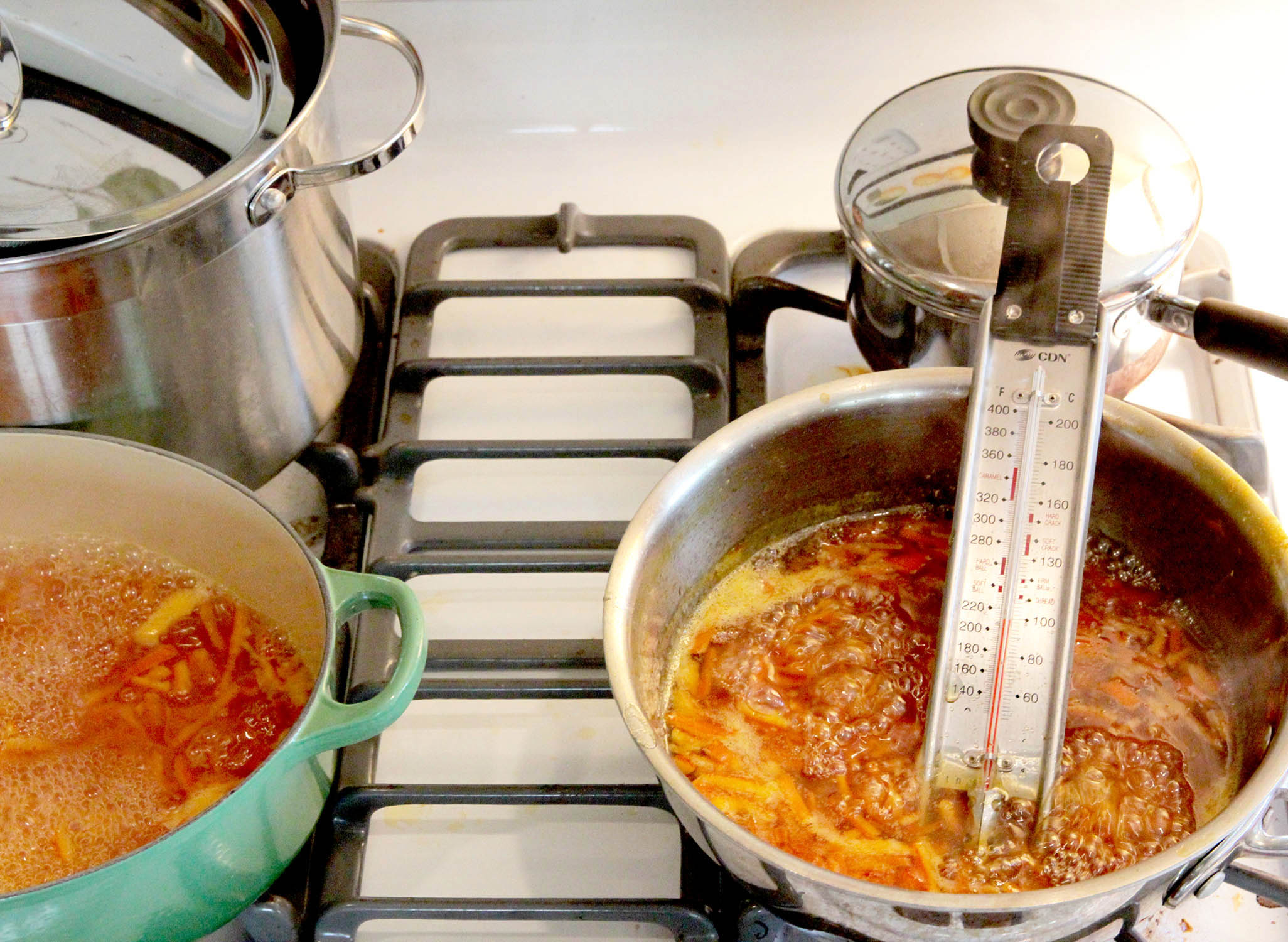 Now put the seeds and the orange guts in a piece of cheesecloth, which you can find at any grocery store, and tie it off. This is where the pectin that’s needed to gel your jam comes from. Sometimes oranges are short on seeds this time of year, so put your lemon seeds in the bag as well. Now, you’ll put your orange peels, juice and 8 cups of water in a big pan and boil the mixture for 10 minutes. Cool, and refrigerate overnight. Set the bag of seeds in a bowl and let that sit in your fridge overnight as well. In the morning, get all your canning stuff together. 6 half-pint jelly jars or a mixture of half-pint and 4-oz jars. Your state extension office is your go-to resource for safe processing of jams and jellies. Here’s some nifty info. that happens to be from Utah. Note the boiling point for a given altitude. You’ll need that. Boil the water, peel, and bag of seeds with the lid on your big pot for 45 minutes. Then add the sugar and remove the bag of seeds. Boil until the sugar dissolves and divide mixture into two pots.