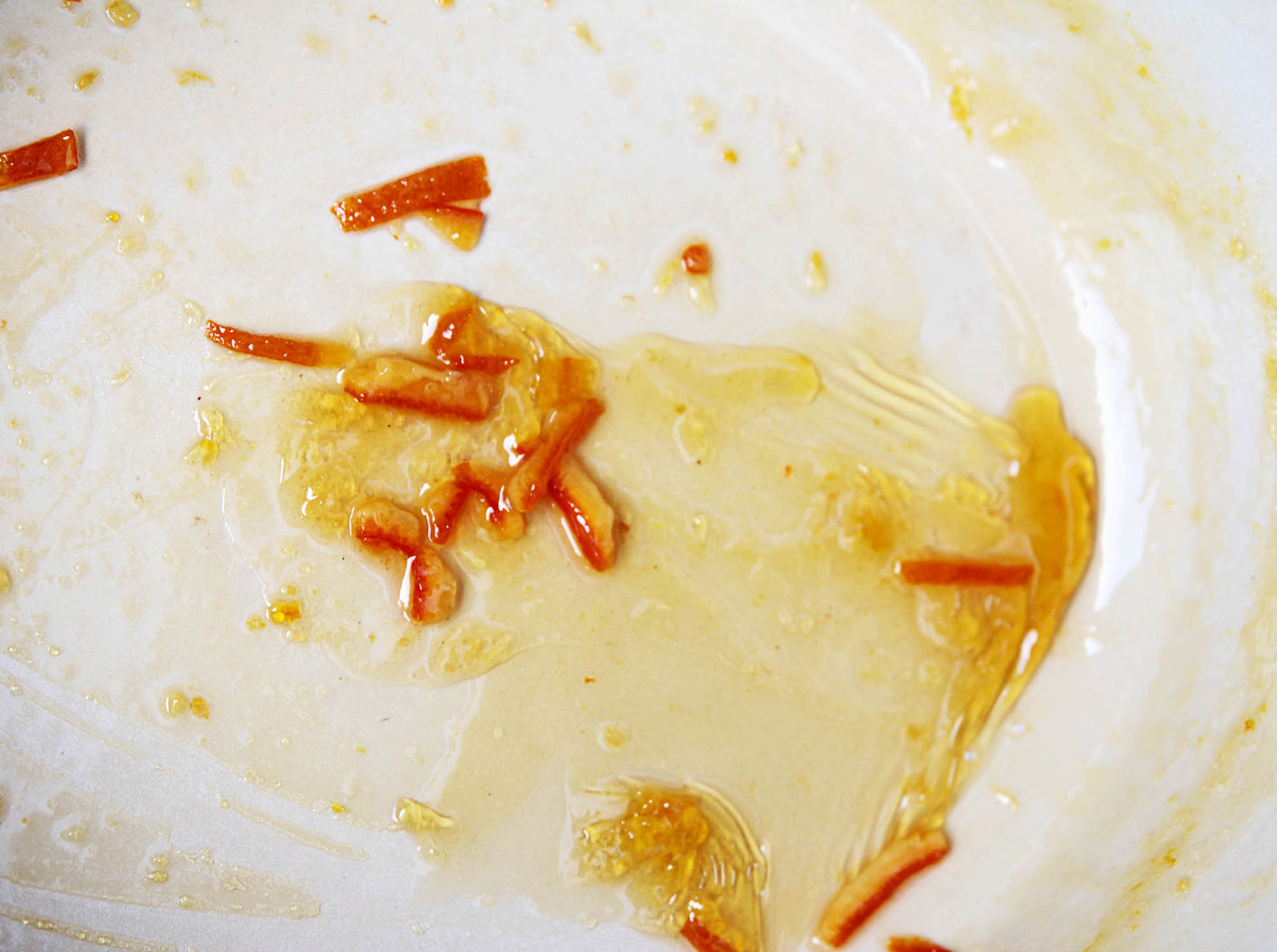 Then cut the peel halves into quarters. Slice very thinly into pieces that are as long as what you want to see on your toast. If you have used a thick-skinned naval orange, then you will use a vegetable peeler and take off the outer peel, save the guts, and compost the white pith. (Don’t use more than one or two navals in the mix.)