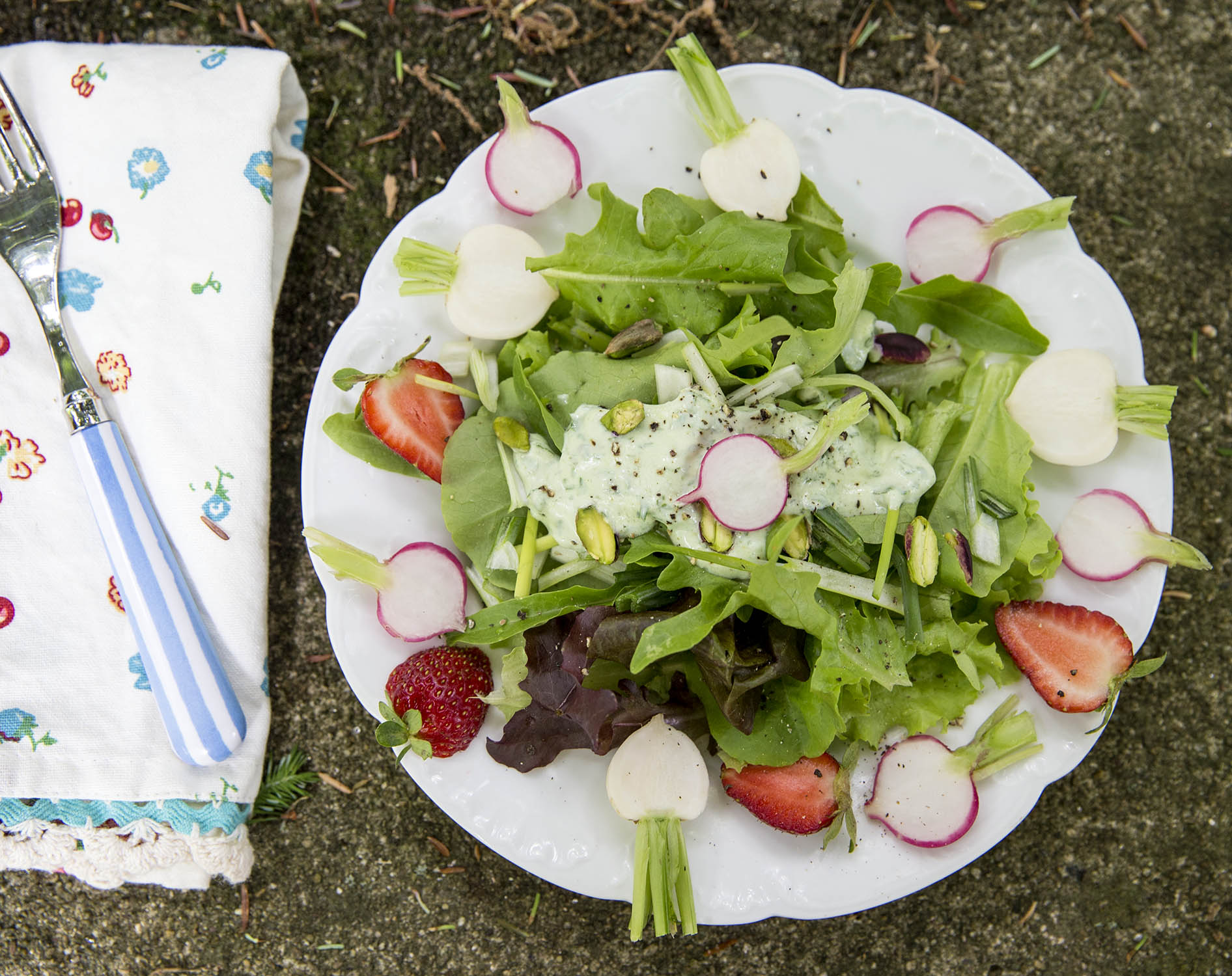 - Cut baby veggies in half, leaving a little of pointy root end and a bit of stem. Save turnip, beet, and radish greens for another meal. Place the veggies around the edge of the salad. Top salad with buttermilk/fresh herb dressing, and sprinkle with pistachios.