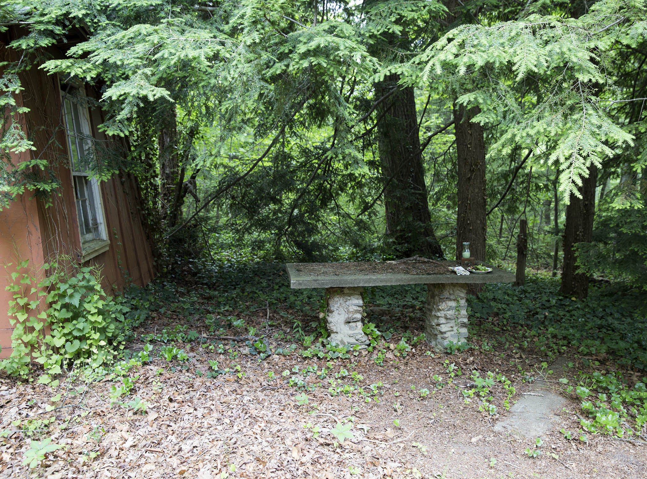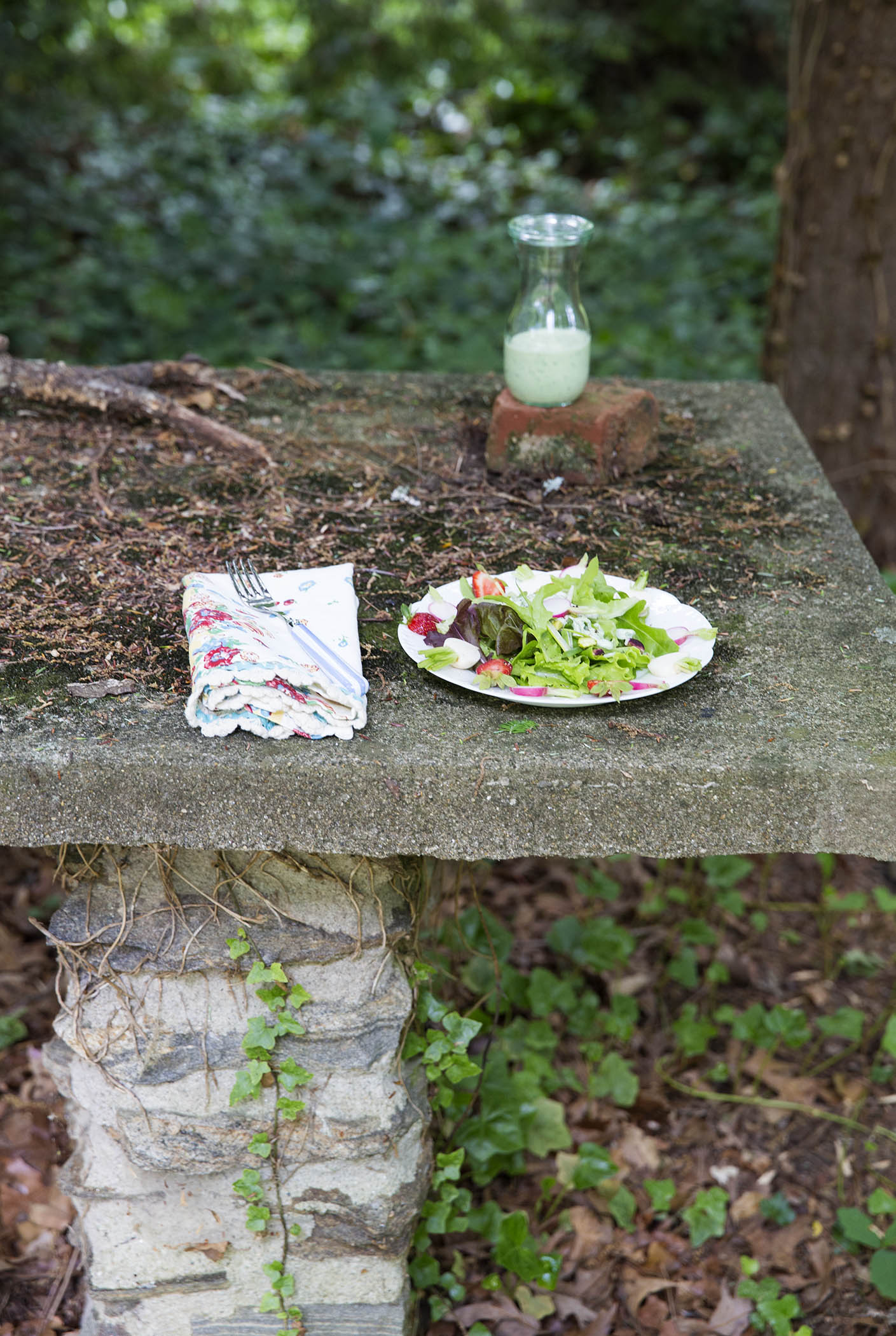 Which brings me back to spring offal salads that look like themselves … and this project waiting to be tackled in this forlorn forgotten corner of our yard: The abandoned concrete and stone picnic table from the 1940’s when our stucco barn of an 1880 house was resurrected. See that slab of concrete on the ground to the right? That’s one of the benches.