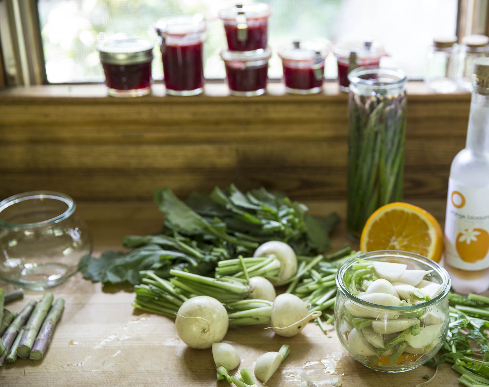 I’m in the pickle phase of my book, and out of all my recent trials, the turnip stems in homemade muscat wine vinegar is my favorite. The pickled turnip stem idea was not mine, it was Hugh Acheson’s. The recipes in his new book are quite wonderful, even though you have to cut the dern book apart to be able to use it. I didn’t photograph the stem pickles, because who knew they’d turn out to be the Cinderella pickle! Below are red onion and cardamom, asparagus spear, and baby turnip/orange pickles.