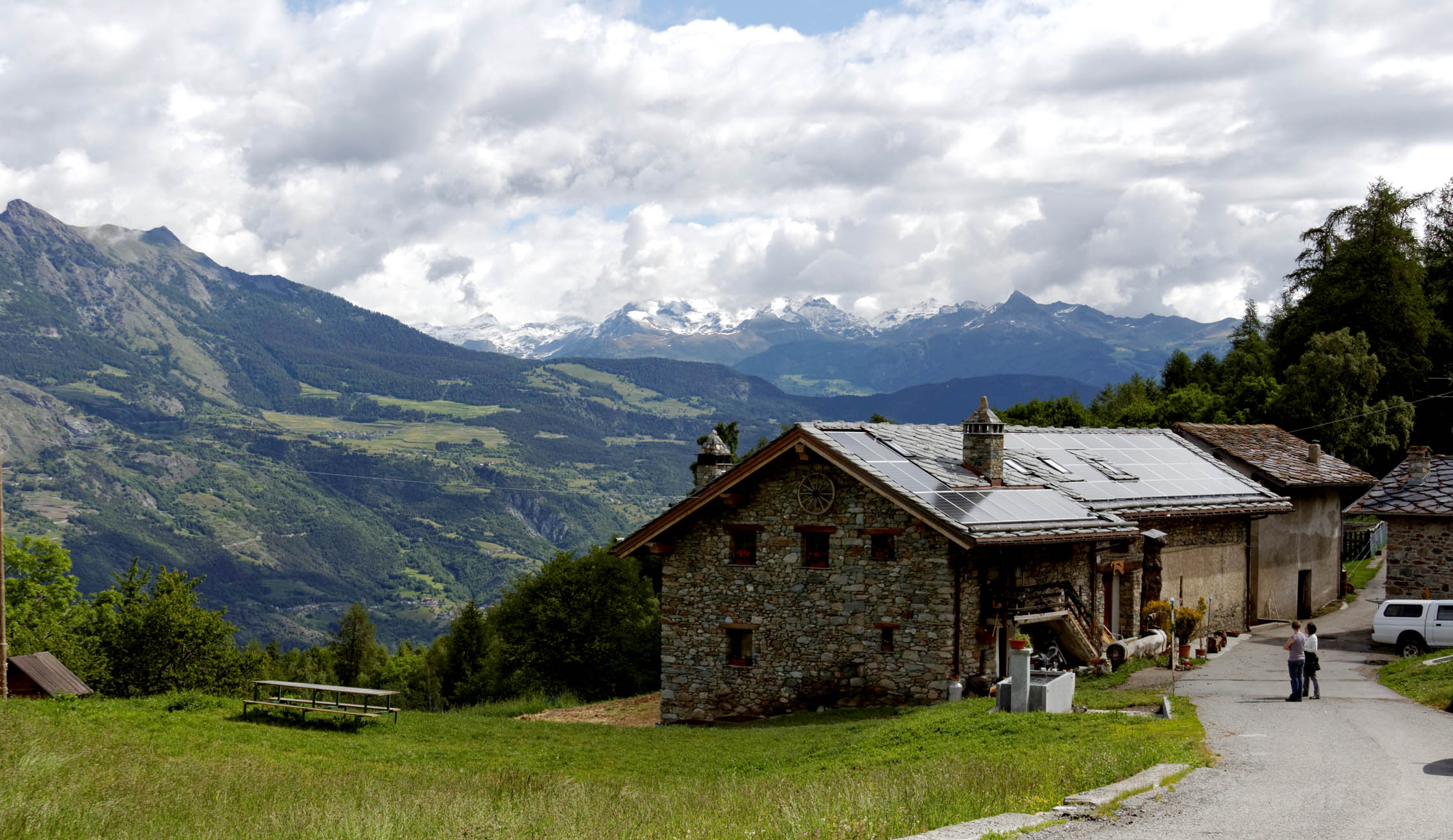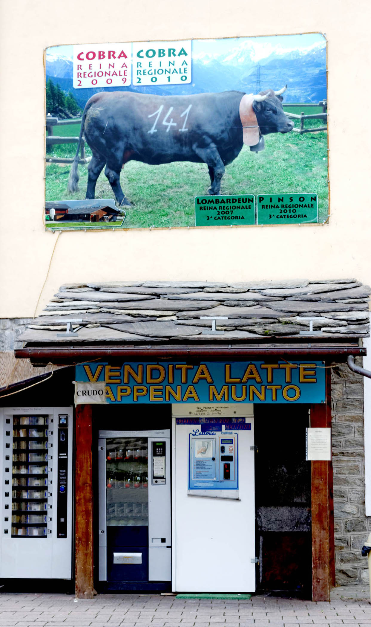IMG_4074Not only can you get fresh milk from cows that are mooing  a mere few feet away, you can also choose from fresh fontina, yogurt, or butter from the cow-automat just to the left of the milk dispenser.  Made, of course, in the cheese kitchen within a stone’s throw of the barn. And that’s not all … see that cow at the top of the page? Well that’s sweet Cobra-the-cow who is pretty much, the most famous cow in the valley d’Aoste for being the cow battle champion several years in a row. Cobra lives in the cow vending machine barn and you get to drink her milk for mere pennies. IMG_4081 Annie learned to make all sorts of fresh and aged cheeses from Roberta … roberta the cheesemaker who lives at the top of an alp with her family … roberta's farm and makes the most amazing cheeses from her cows and goats ever … roberta's cheese And here Annie learns from a cheesmaker from Branzi, only a 30 minute blood-curdling mountain road drive from another well-known cheese town of Taleggio.
