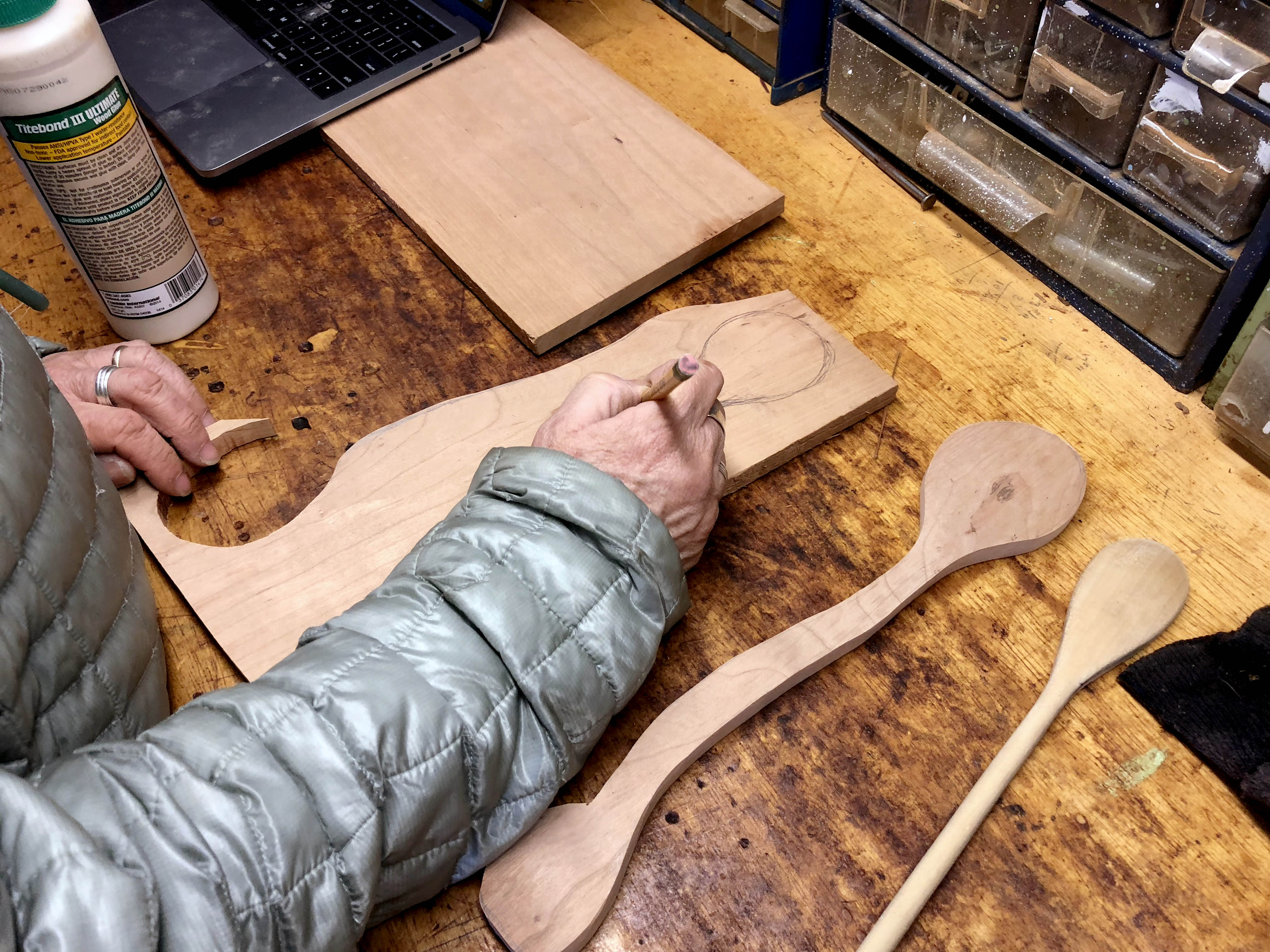 And quite honestly, I have NO idea what I’m doing. For now. In the immediate future I plan to get me a good hatchet and commence to learn the art of Swedish green-wood carving. In the meantime, here’s how I made this spoon. Believe me, if I can do it, so can you! All you need is a friend with a jigsaw and maybe some rasps to help you get started. First, you will need to draw a picture of the spoon you want on a piece of non-toxic native wood. We are using cherry for our spoons.
