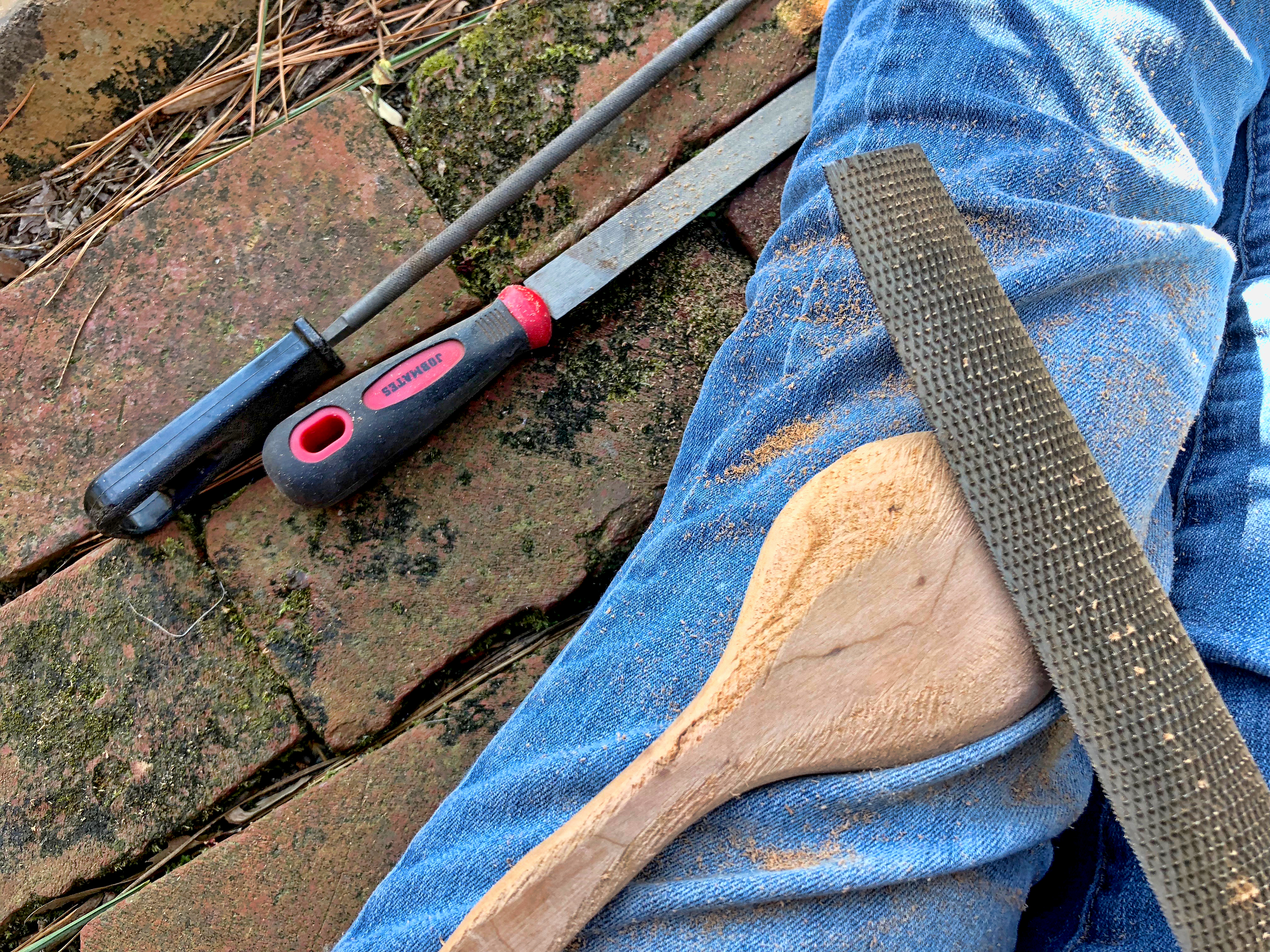 Then you will sit in the sun out in the yard and start rasping the square edges off your spoon. Or in the case of Janet, who will do something different because her husband Roger (the do-things with tools guy who is teaching my daughter, Annie to blacksmith) says “there is a WAY easier way to finish off your spoon!” Evidently, as you will see I do not know what that is. Anyway, rasping is fun and you can quickly round out your spoon and handle starting with the rough rasp and finishing with the finer one.
