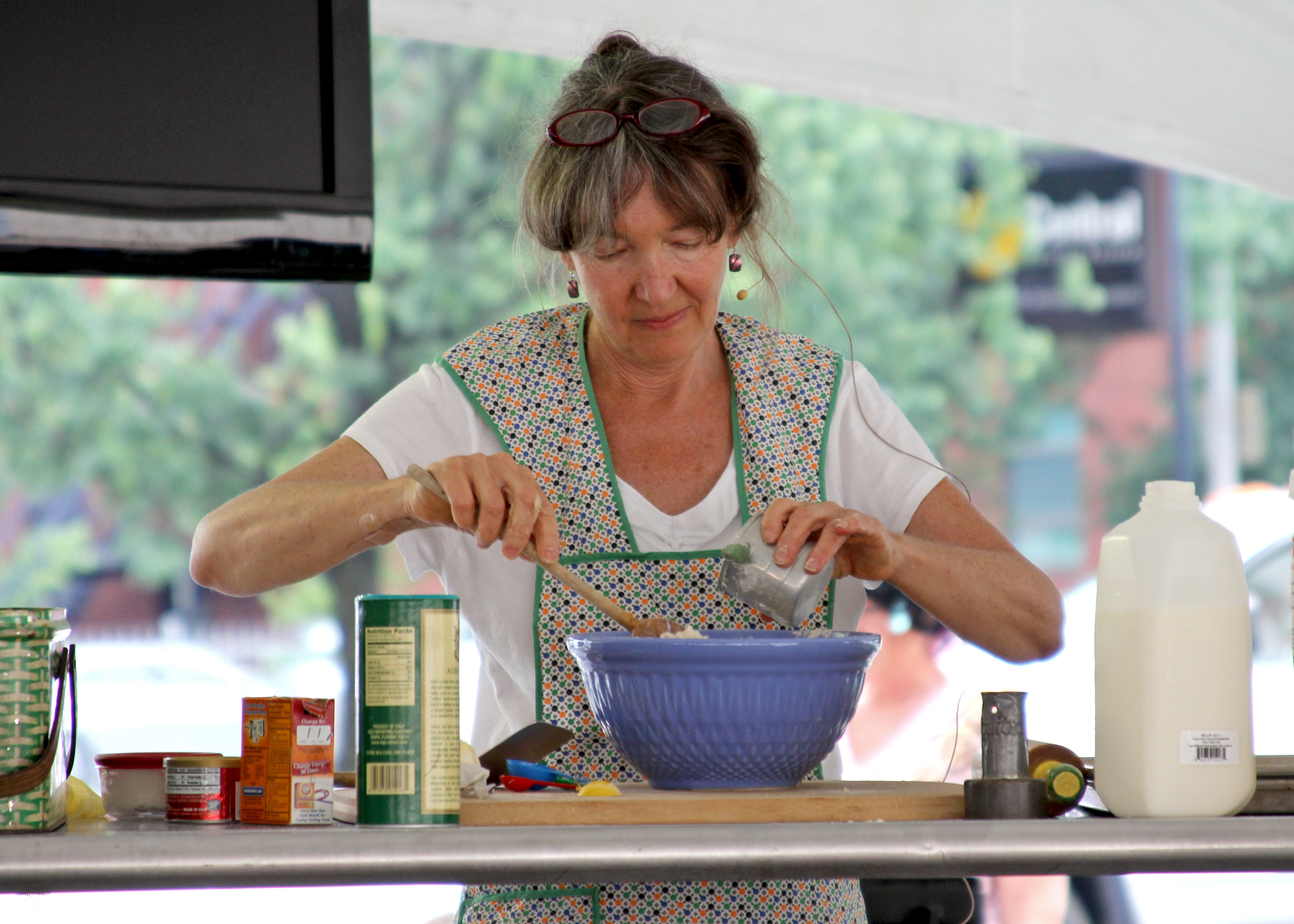 And, finally, I demo’d local ingredient southern mountain biscuits. Which would have been great if they weren’t the worst things I ever put in my mouth. Ever. See those glasses on top of my head? Well I was tired by then. Evidently I was too tired to put them on my eyes so I could see what I was doing. Too much leavening and not enough salt, baked in a hot convection oven made for bitter, insipid, glunky biscuits. When I saw a daschaund chewing on one, I knew I was in trouble. After sampling from the tray I was serving from, I ran to save the dern dog’s life! (And promptly threw the rest of them in the trash.) Lesson learned: taste before you share! I would offer up my biscuit recipe but I don’t think I dare! Besides that, I am over-biscuited. How about some kale?