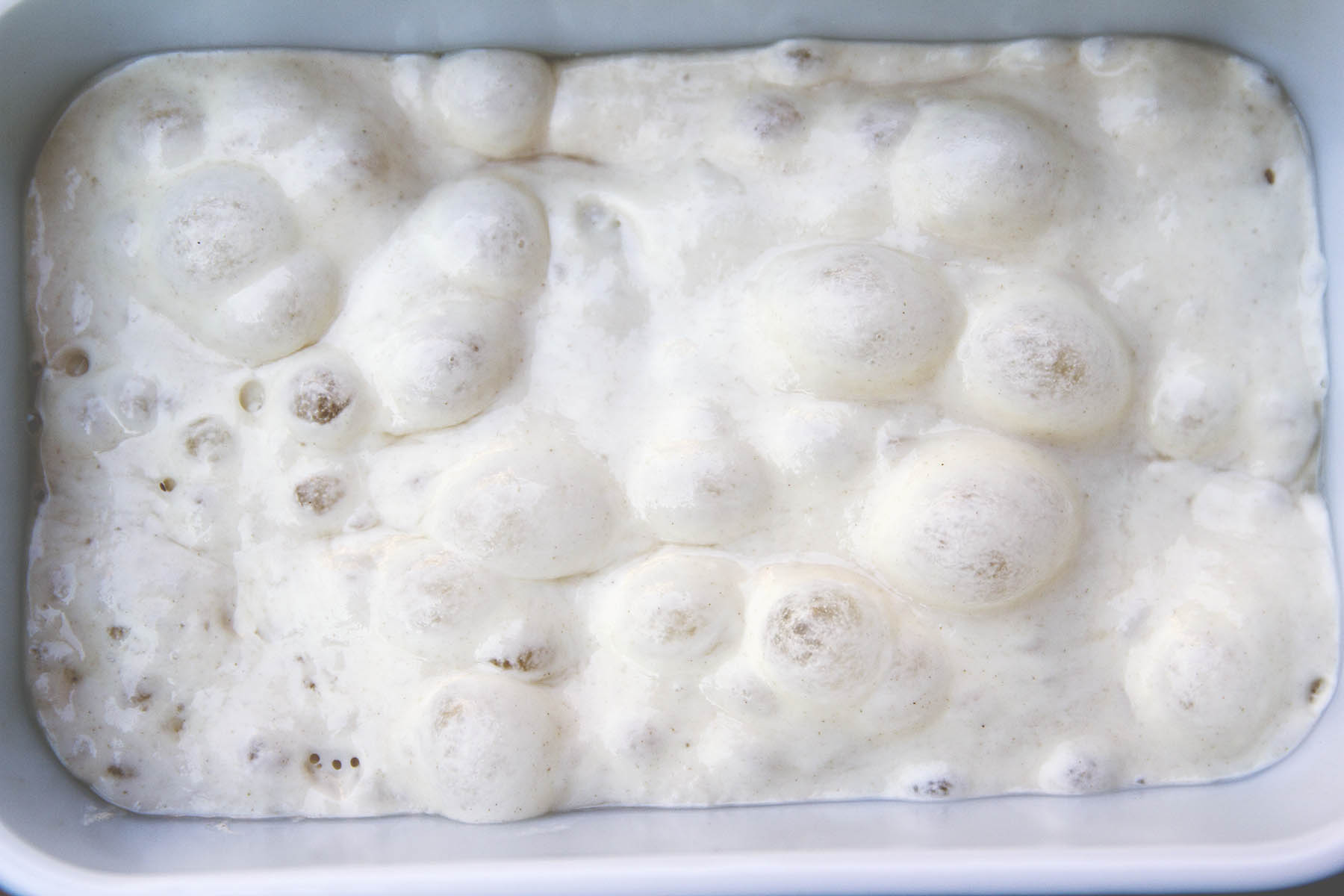 See this sponge? It’s almost past it’s prime. The bubbles are huge and you can see little lines beginning to form on top which means the yeast have scarfed up the available food and the party’s winding down because I was playing with new fonts. Way over in the bottom left corner is how a ready-to-go sponge should look.