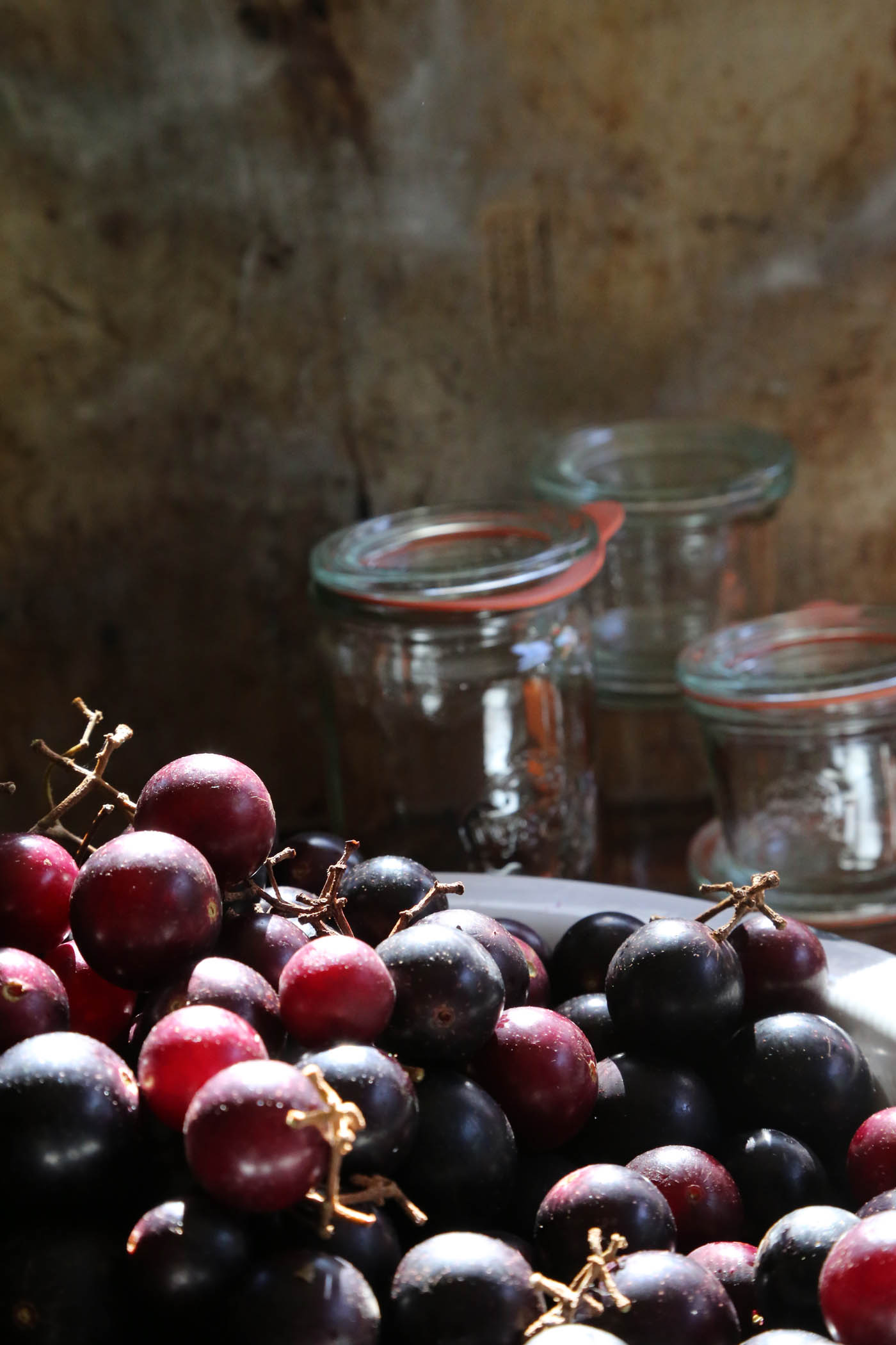 Muscadine grapes grow from West Virginia clear down to Florida, but North Carolina lays claim to the origins of this voluptuously-flavored southern belle. The bronze-skinned Scuppernong variety was discovered/found growing, by colonists in the mid 1500s. The term Muscadine refers to both the black cultivar (my particular favorite) and the greenish/bronze varieties, but most folks call the black ones Muscadines and the greenish bronze ones Scuppernongs. I’m no expert but there are a LOT of people who are, namely these North Carolinians and these.