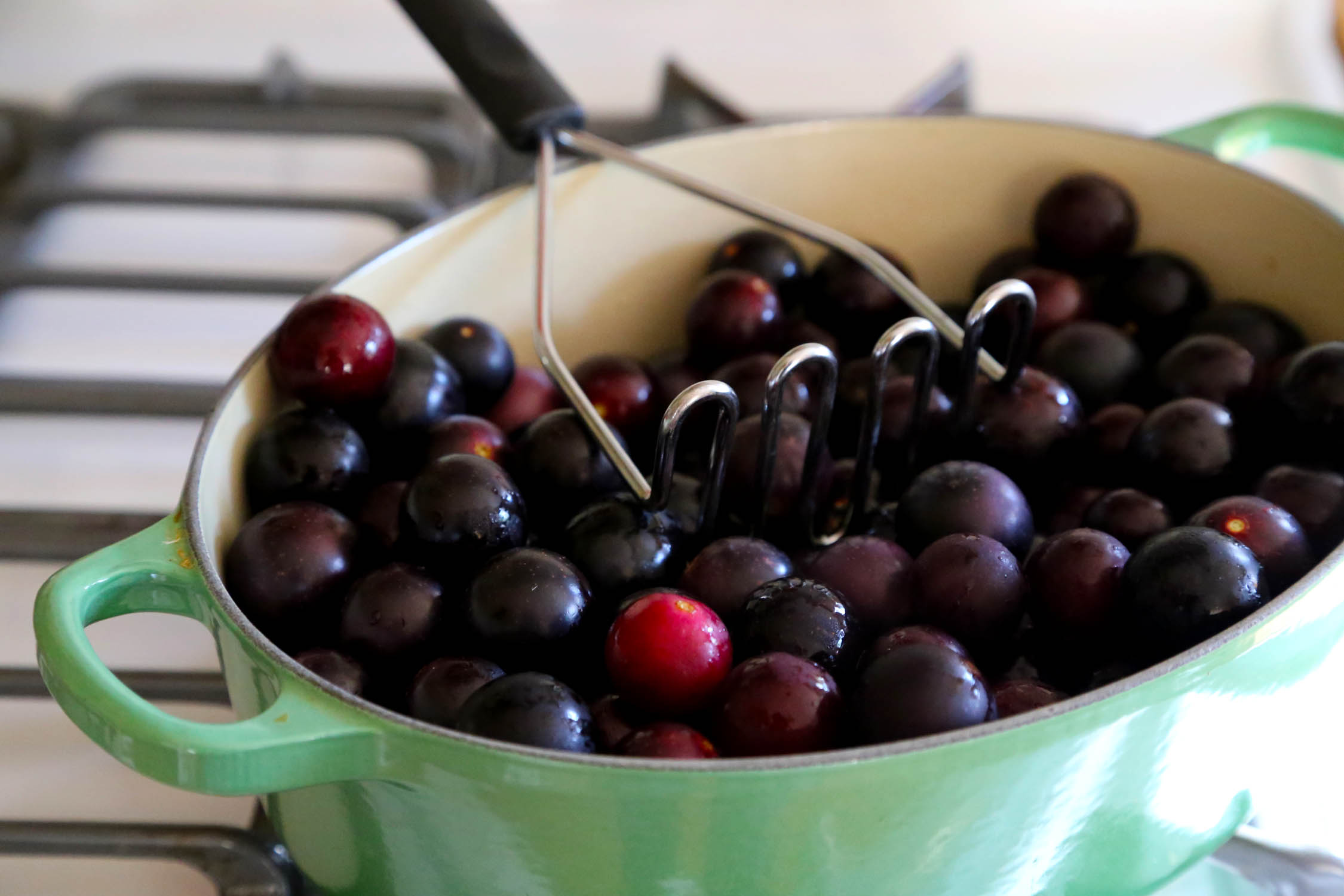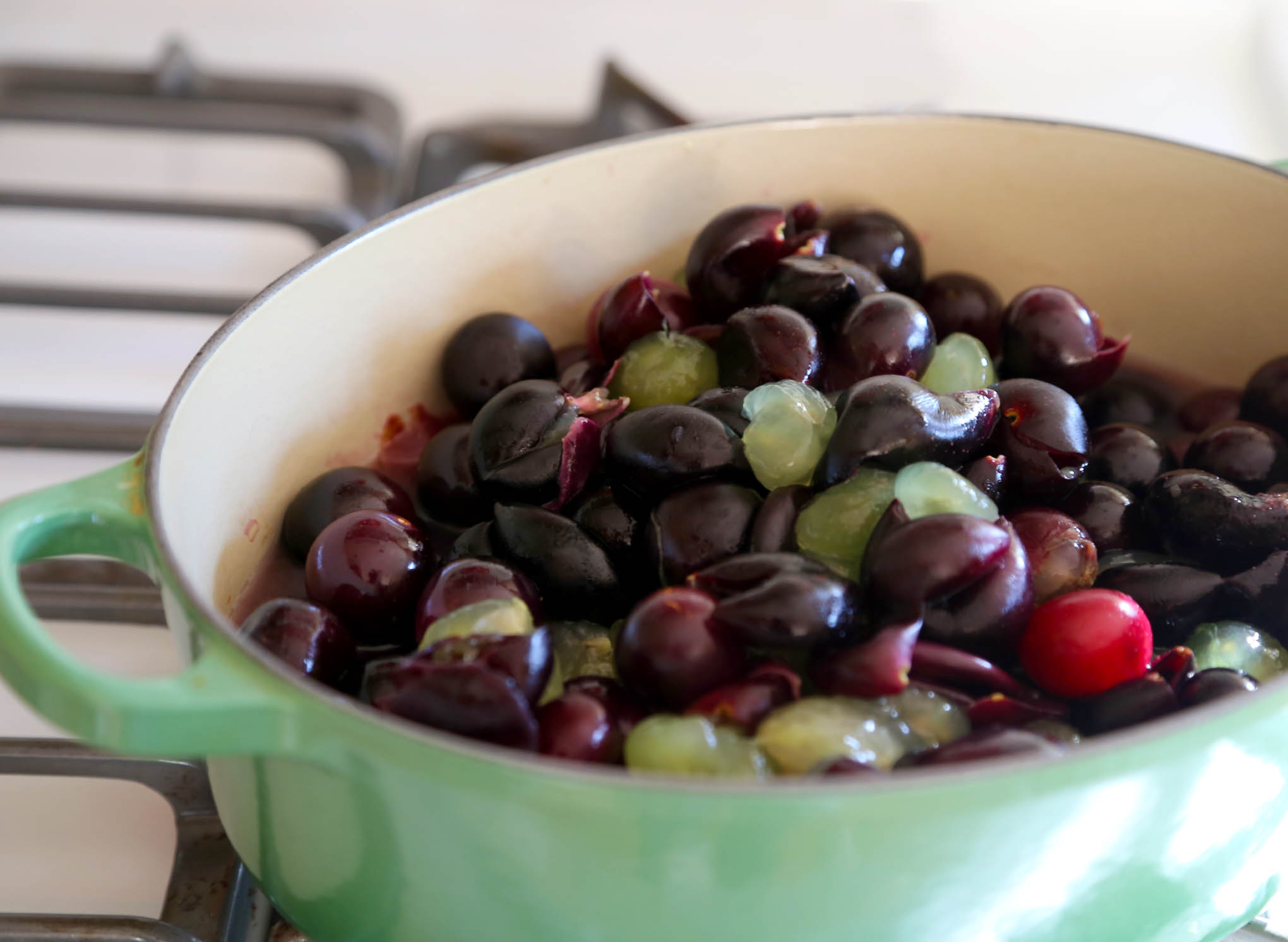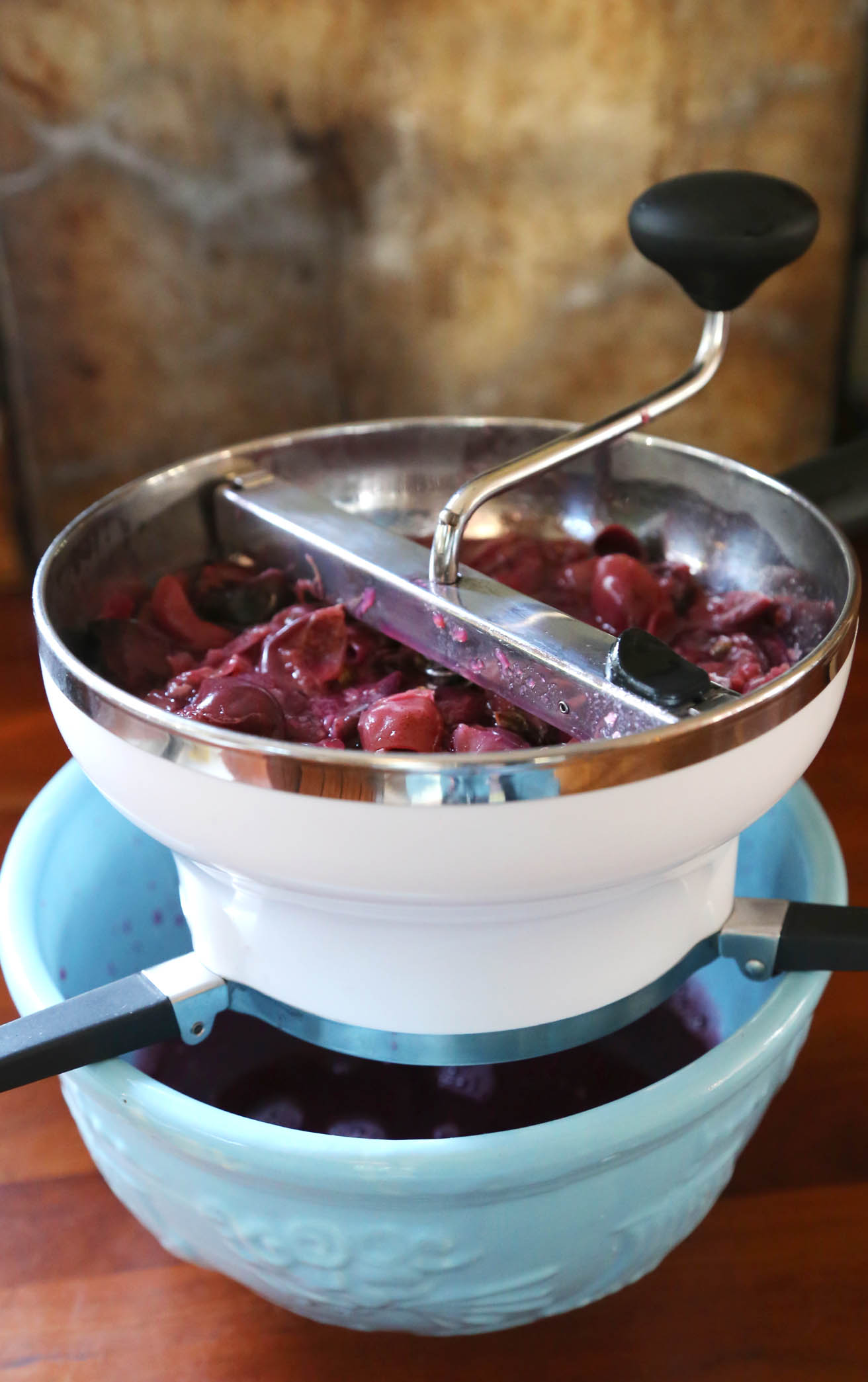 At this point, you will need to find some way to remove the very thick skins and seeds. I use a food mill with removable blades, which I recommend you have on hand … especially if you do any jam-making or tomato saucing. This one is an OXO, which never fails me, and there are lots of others. Use the medium blade for this adventure.