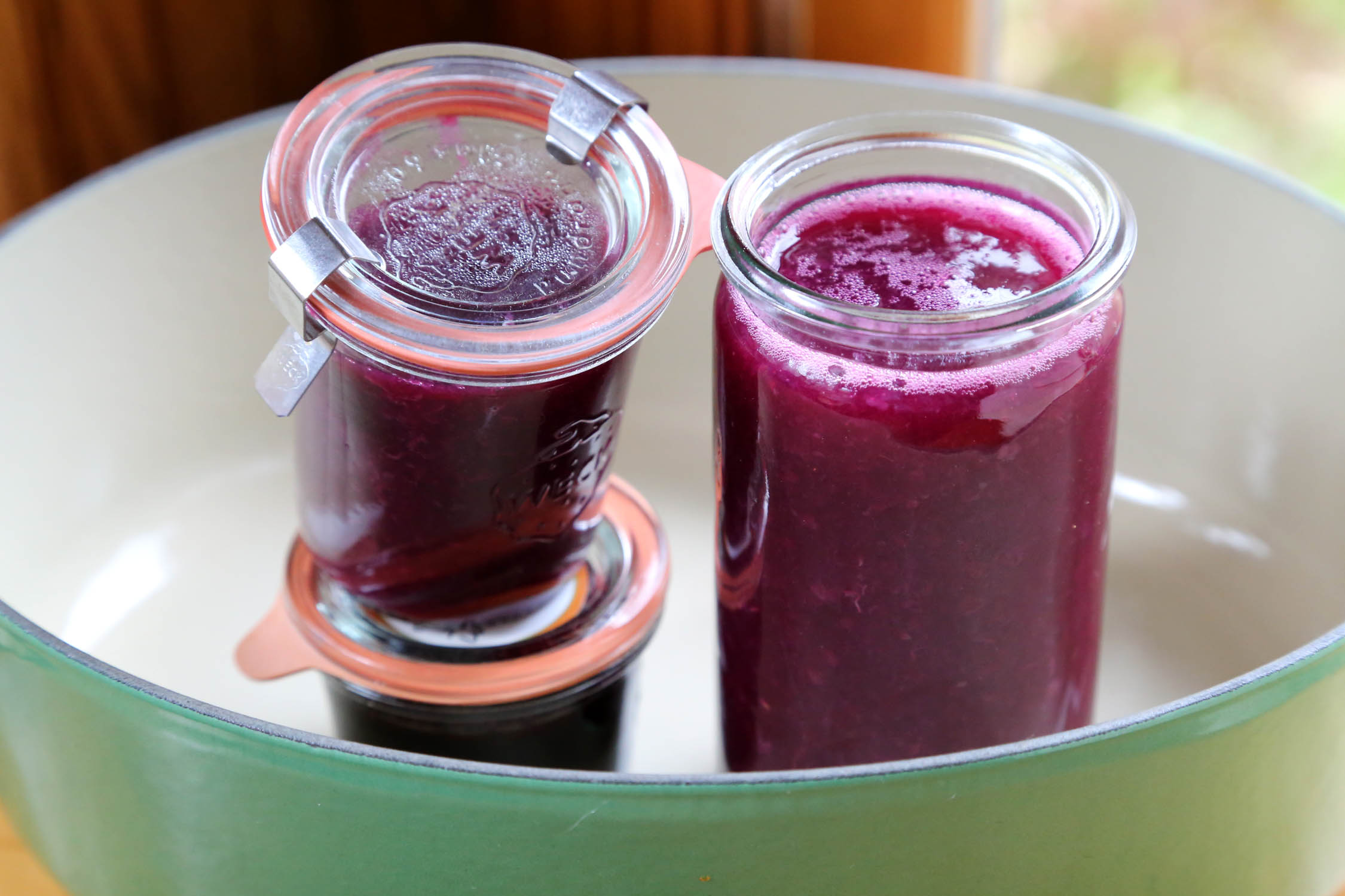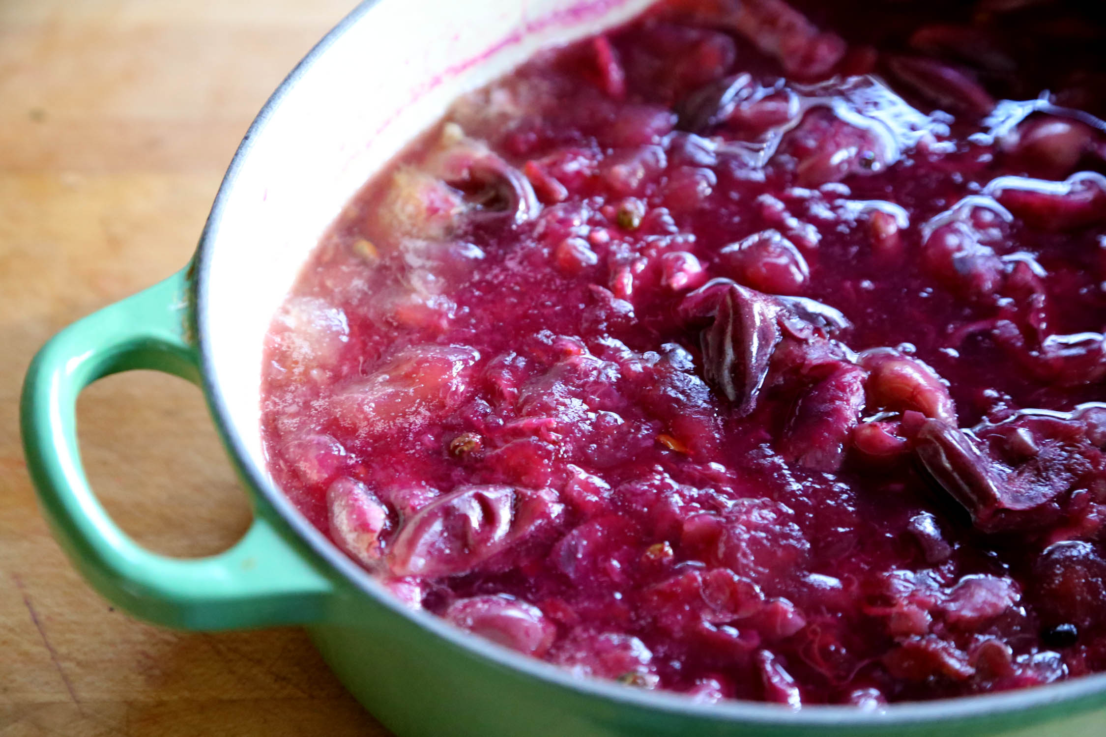 Don’t discard the skins and seeds just yet. Boil in a bit of water for a few minutes, strain and save for light sipping. Meanwhile, in your blue bowl, you will find grape pulp on the bottom with a layer of juice on the top. If you like, pour off the juice and save it to make sorbet (freeze or water-bath can) or jelly. Return the remaining pulp to the pot and continue to cook until it thickens a bit. Do not leave the room and burn your Muscadine sauce. It’s sweet and it will scorch, believe you me. You can sweeten the sauce with a bit of cider syrup (reduced fresh cider), honey, etc. But I like mine as-is. It’s wonderful on farmhouse-style cheese, in a salad dressing (recipe below), or as a marinade for chicken or pork or other meats. Or purple tofu.