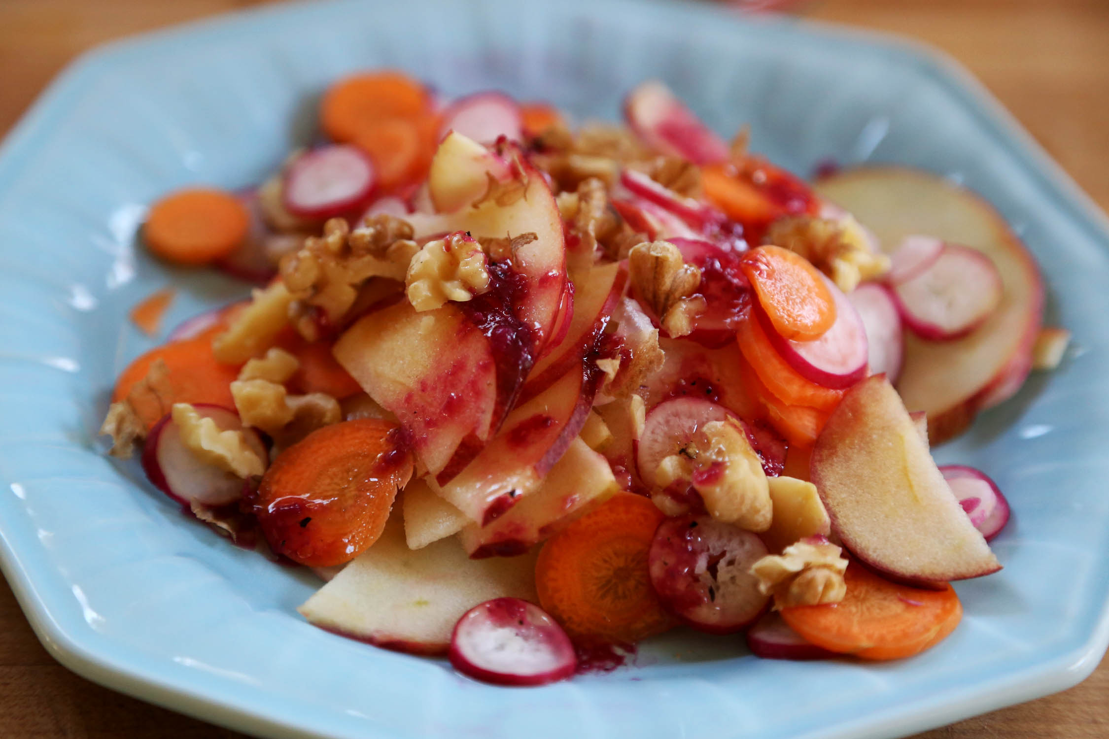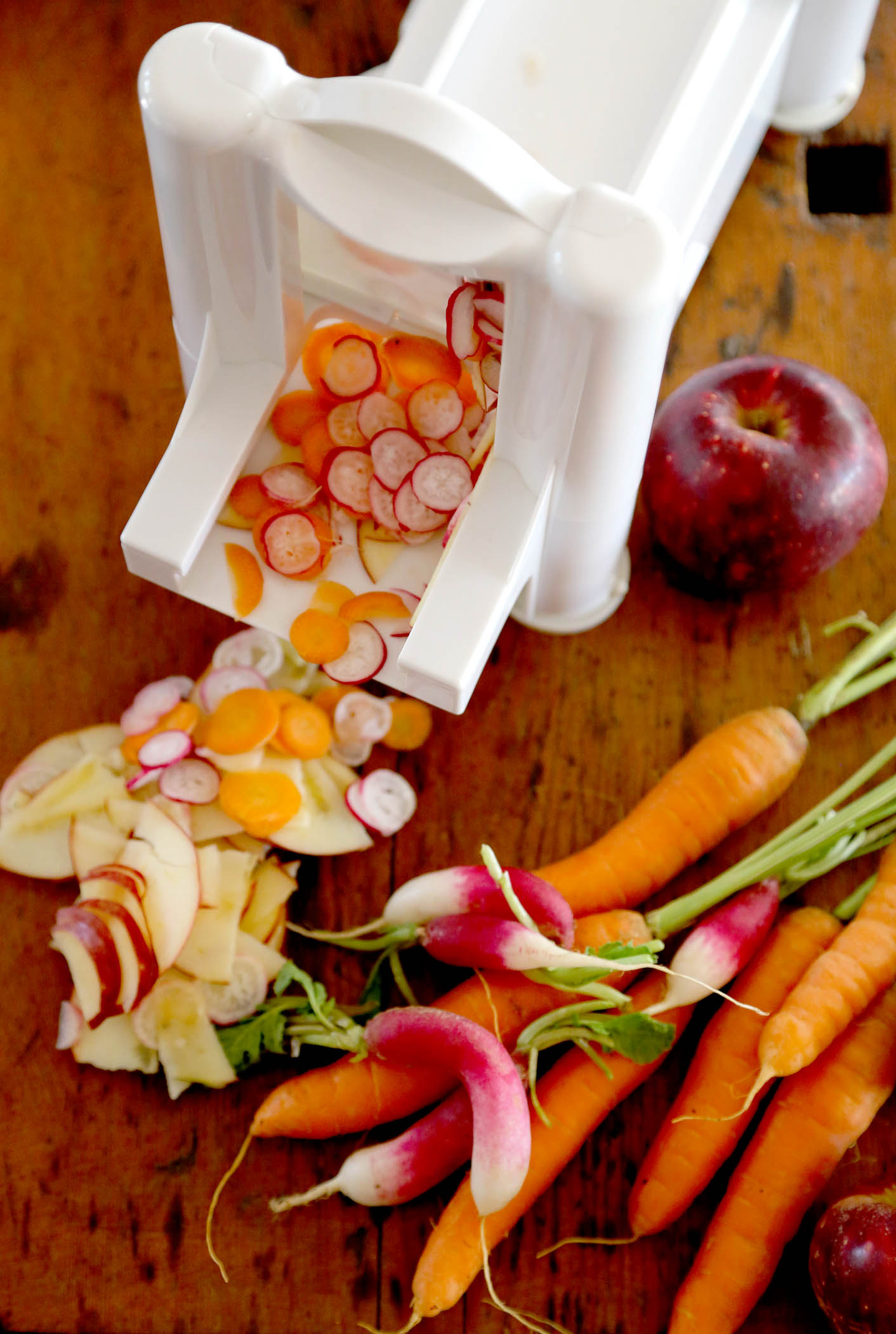 Thinly slice radishes, carrots, and crisp apple using a knife or a ridiculous gizmo like this one that makes zucchini noodles or curly fries. You definitely do NOT need one of these; what was I thinking. Even though I love it.