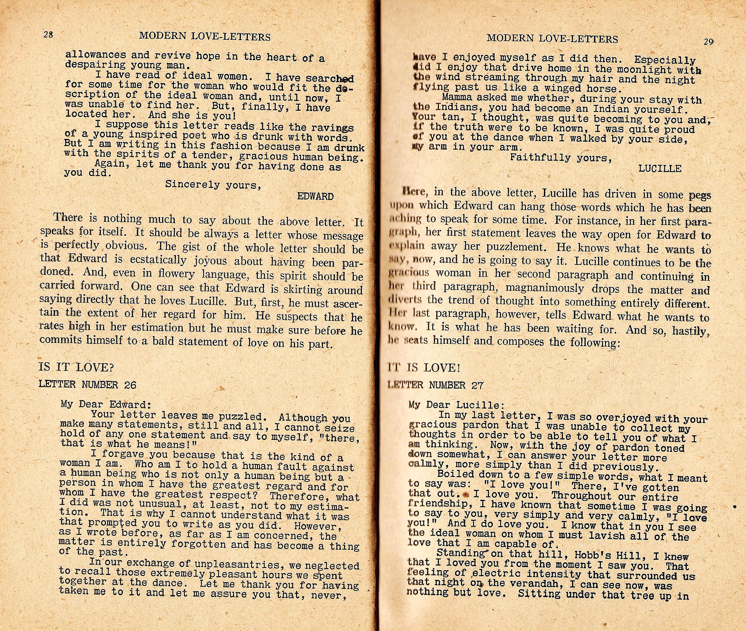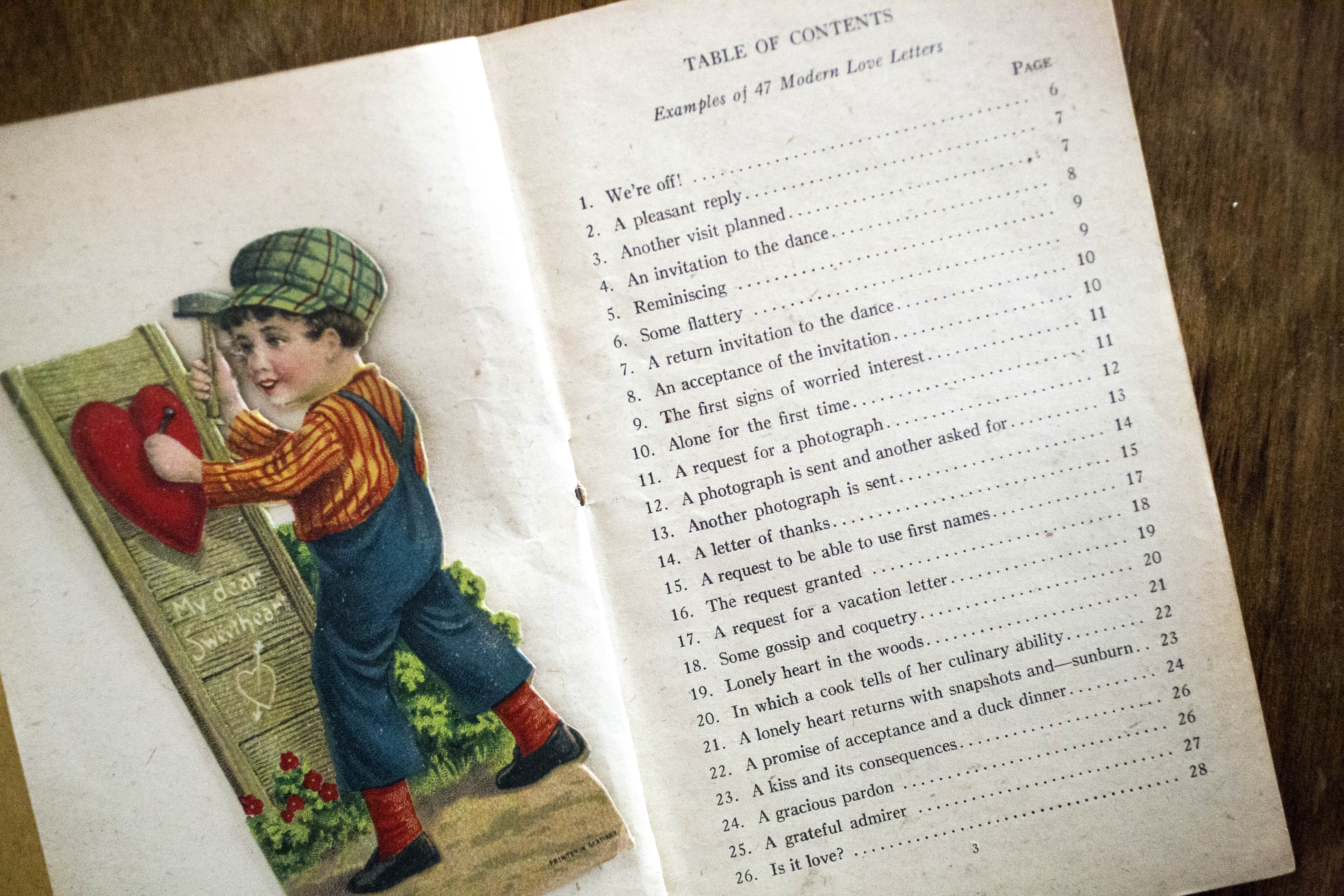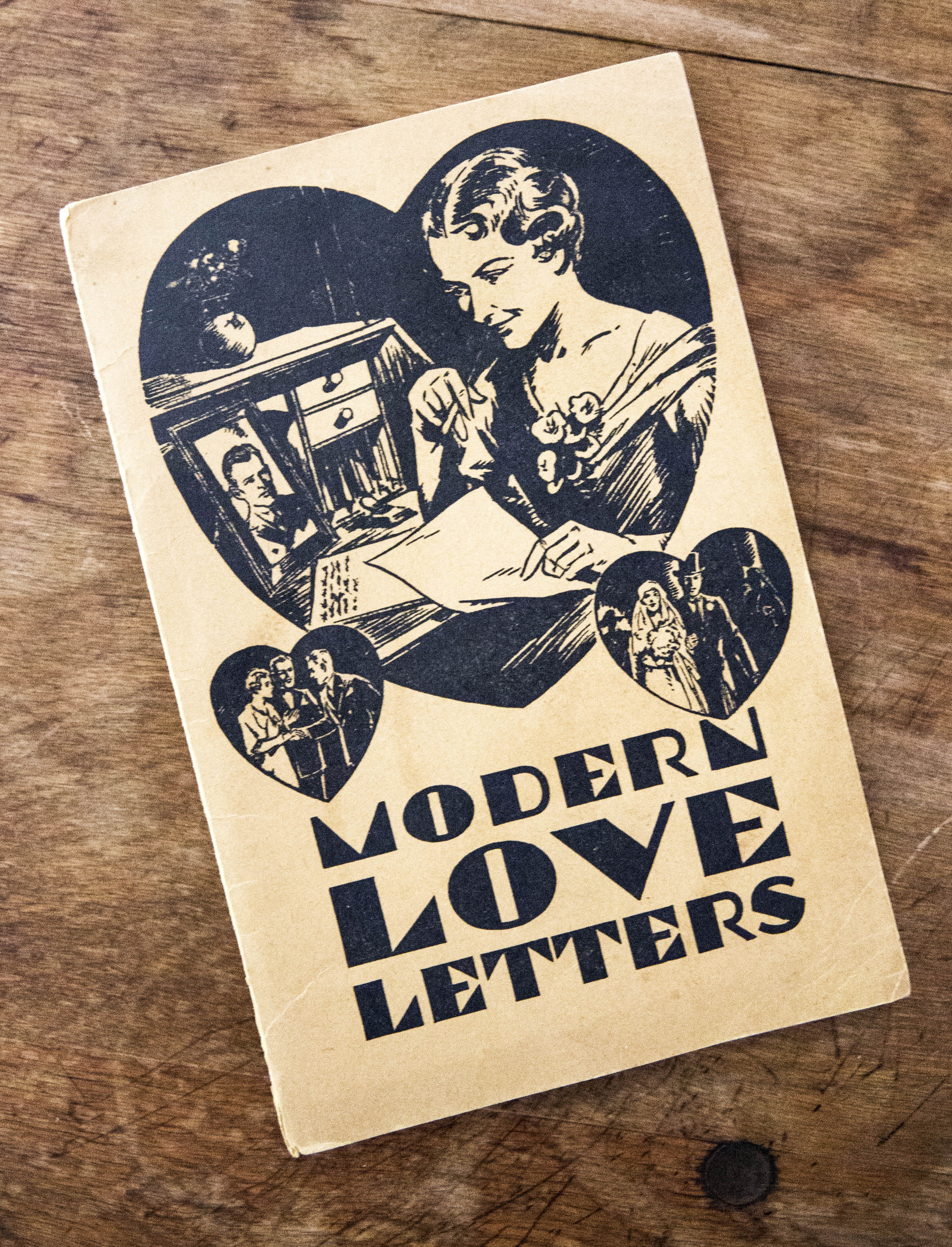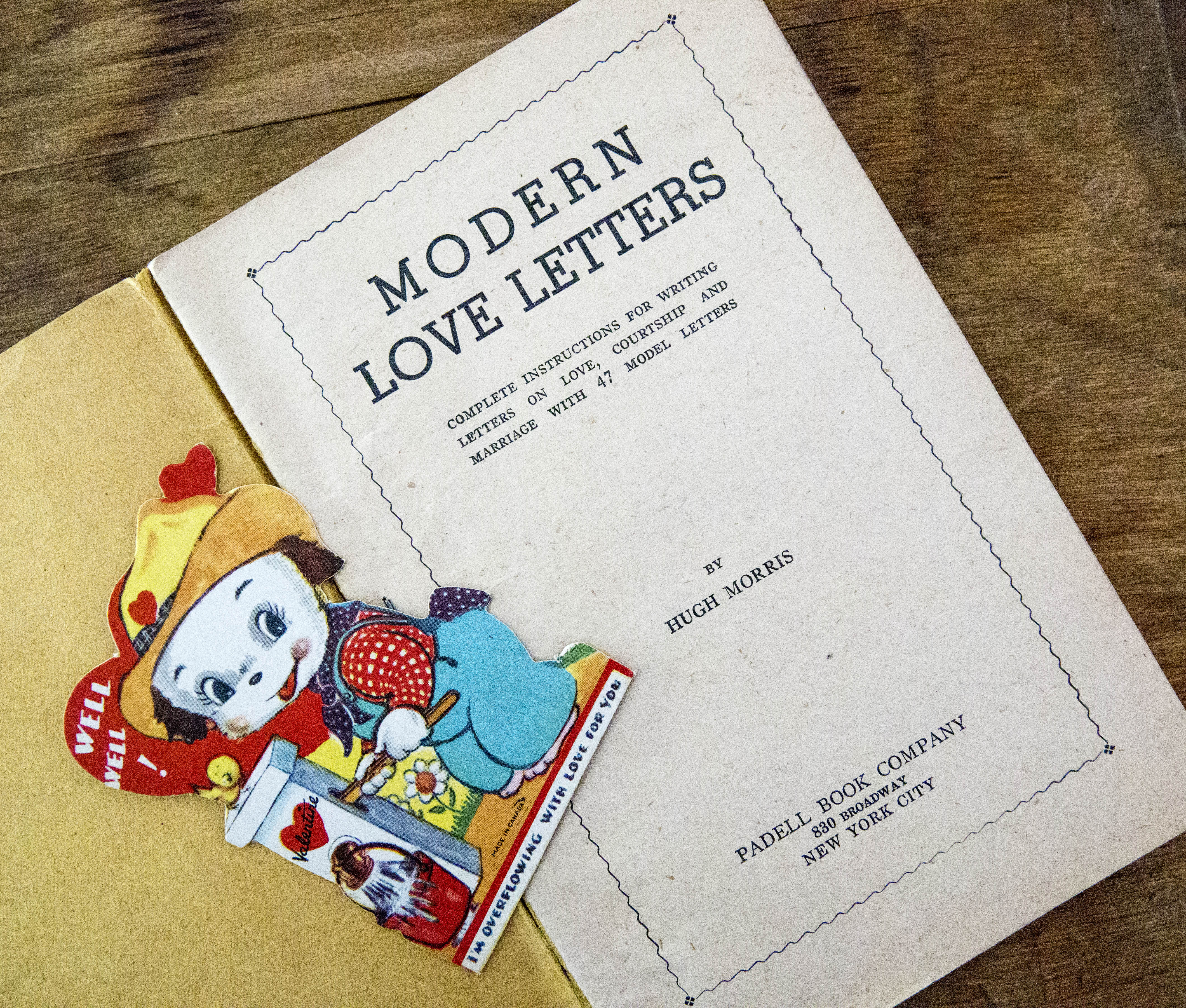 Let’s say you’ve found a love interest. This 1931 book below has some excellent communication advice for both fellers and fems. Except that it’s a girly looking book written by a man named Hugh, bless his heart. And speakin’ of hearts … what guy would buy a book covered in hearts for himself back in 1931? Who, really, is this modern love letter advice for?