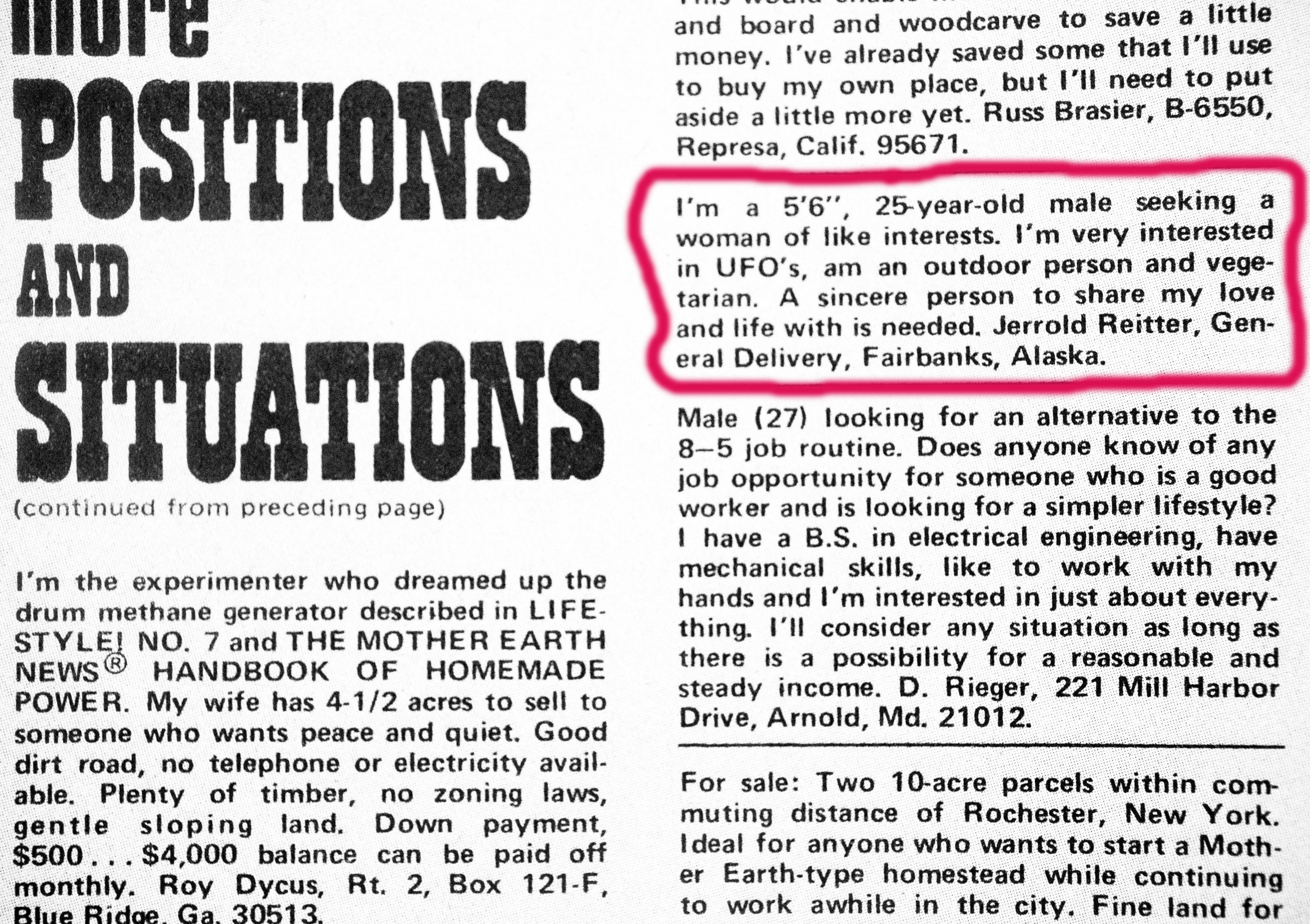 As you can see, the 1974 Mother Earth News Lost Souls and Positions and Situations pages held promise for love seekers as well …