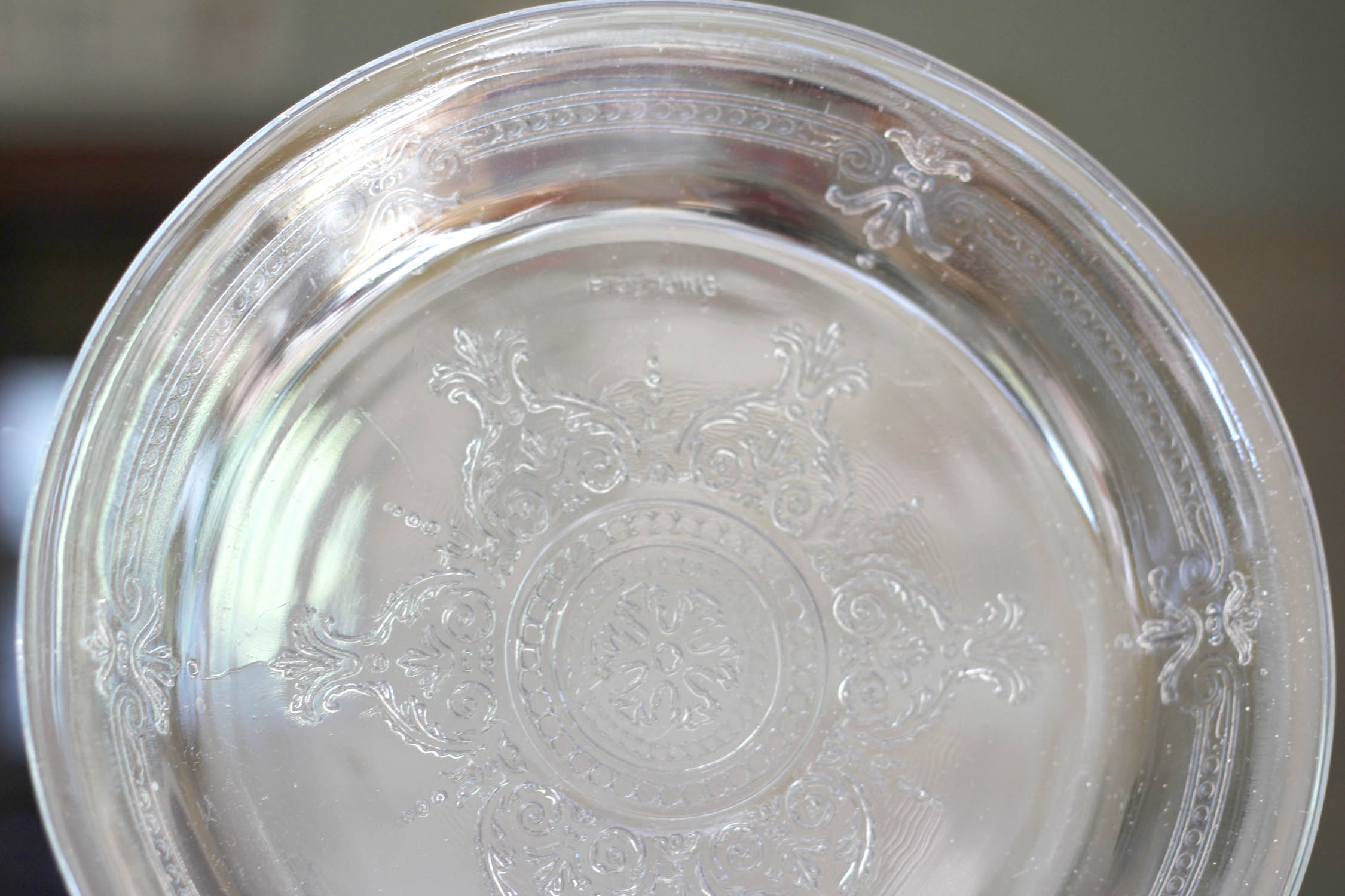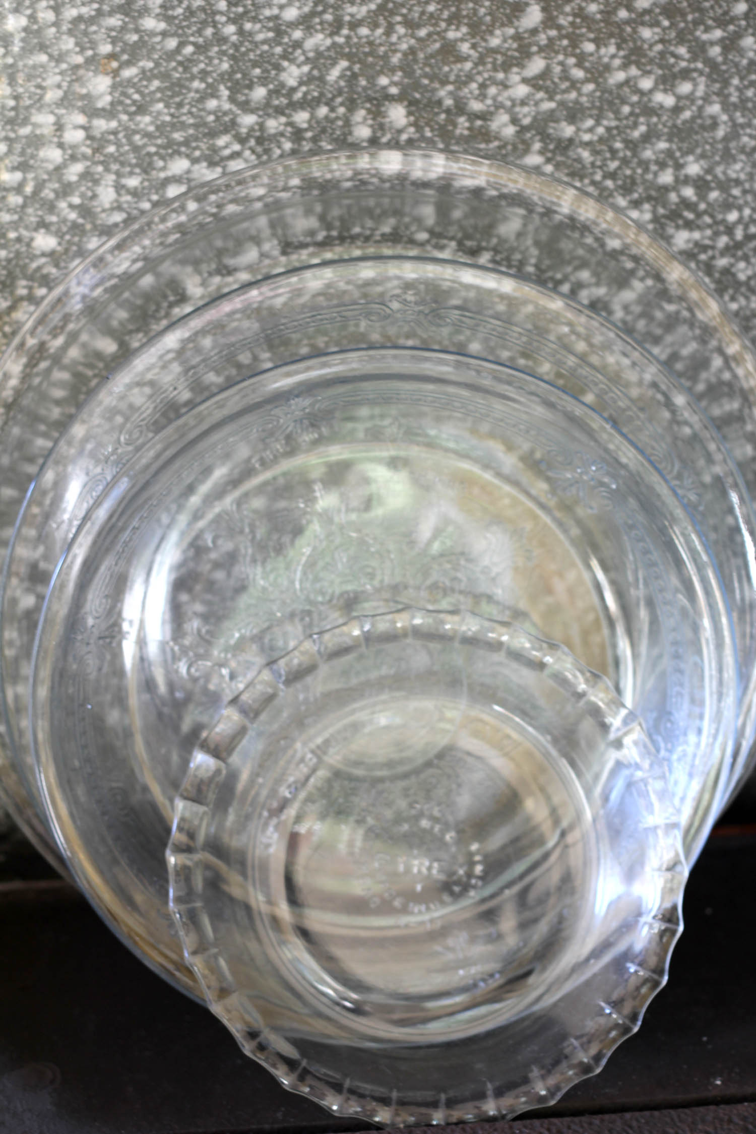 If you look at these pie plates lined up, you’ll see at the bottom a 6-inch pyrex pie plate, then an 8-inch Fire King, and then a 9-inch Fire King, and then a 10-inch very shallow pyrex for those big families. I adore vintage pie plates like these and they’re easy to find at yard sales and antique booths for under $10. The Fire King Sapphire Blue Philbe was made from the early 40s through the mid 50s and these clear pyrex plates are from the 1950s I’m guessing.