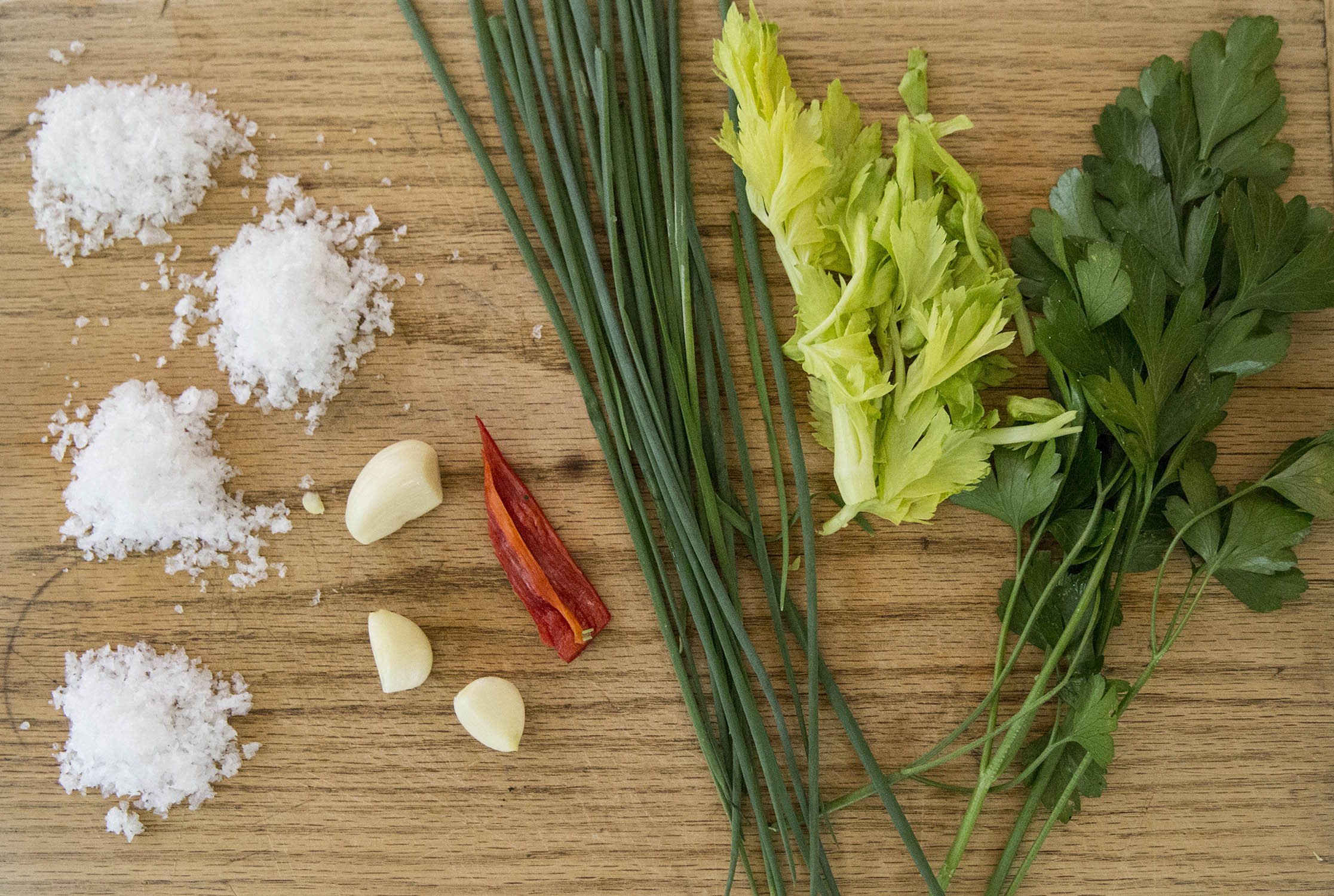 - CELERY HERB GARLIC SALT: 4 medium cloves garlic, 4 Tbls. coarse salt, handful of fresh chives, parsley and celery leaves, hot red pepper to taste