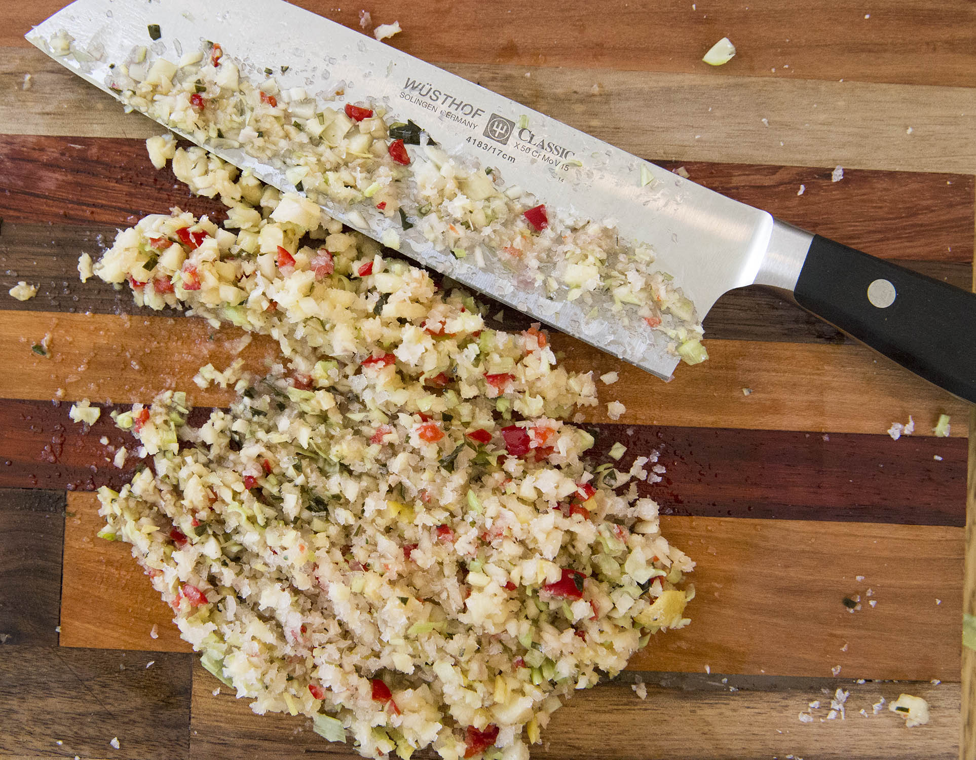 To make each salt, you start by chopping the salt and the garlic together until they’re medium dice. Then you add the other ingredients and you just chop until everything is way fine. Don’t be in a hurry, enjoy the fragrances!