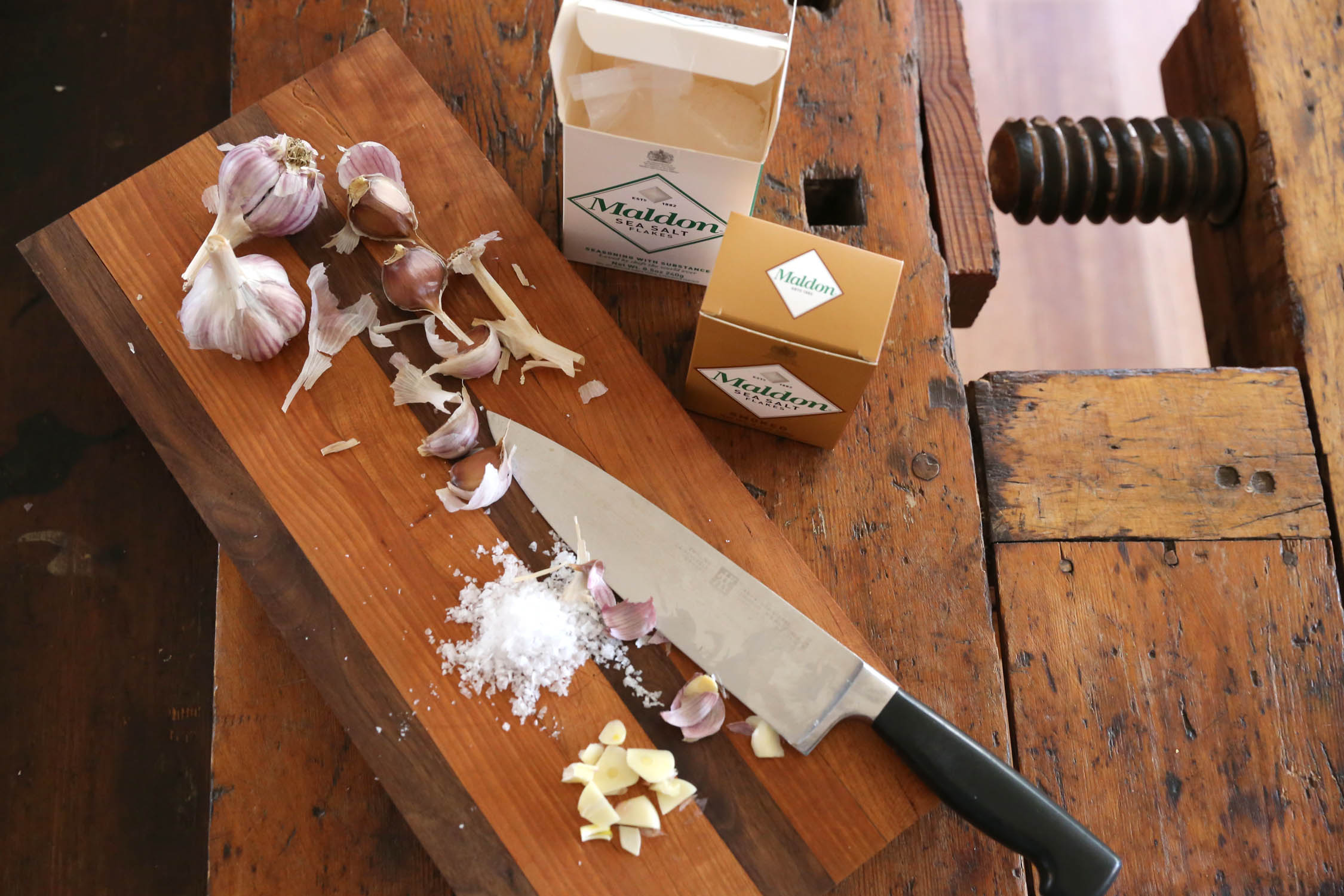 RATIO of GARLIC to SALT: One medium clove to one tablespoon of big flaked, crunchy salt. If using Kosher salt, you can use one large clove to one tablespoon of salt … or two small. You get the idea …