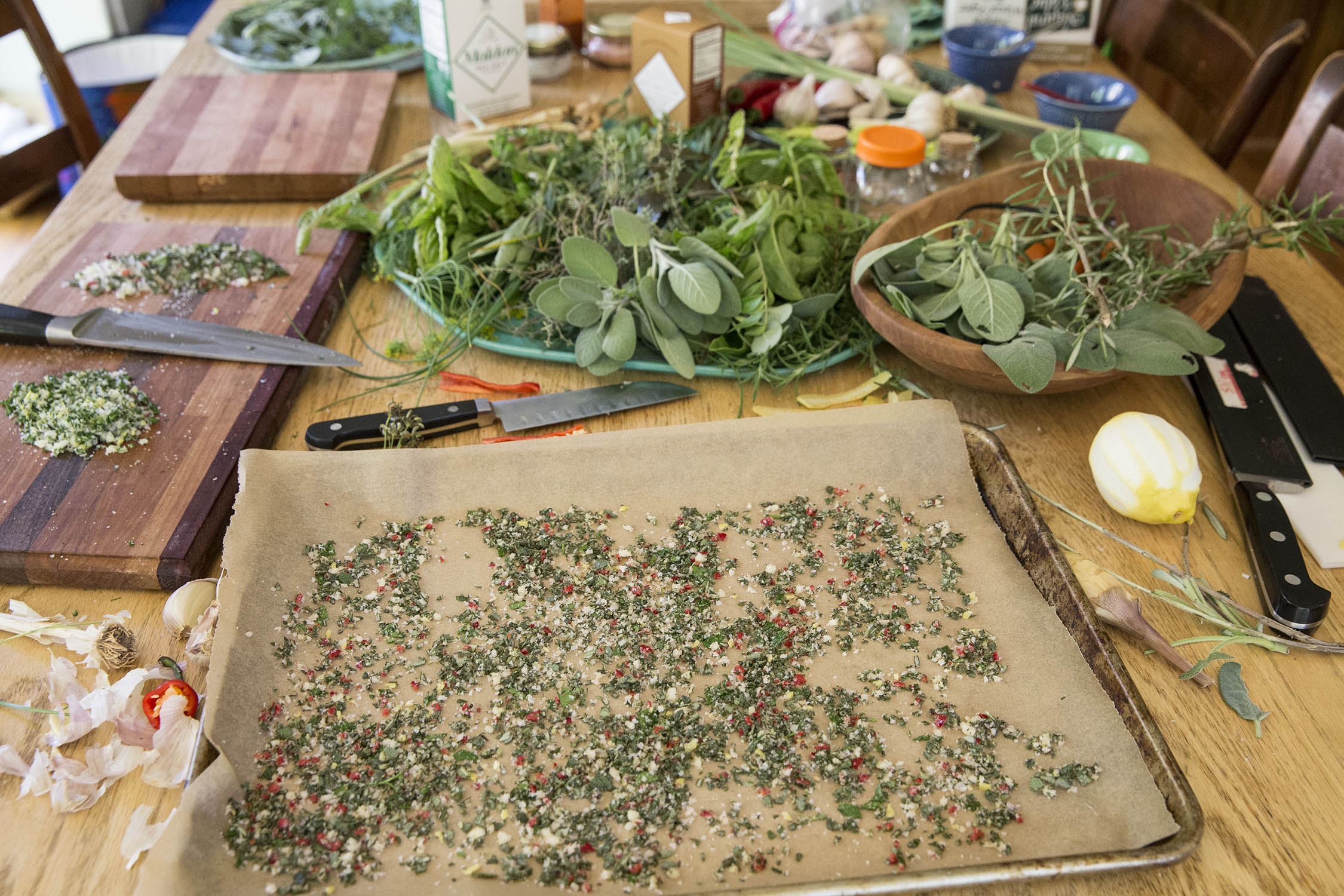 So if you have a hankering to be a culinary hootenanny rock star among your family and friends this holiday season, I recommend making a couple of these garlic salt blends and packaging them in nifty little jars to give as gifts. They’re so easy and fun to make. I invited a few girlfriends over for a fall garlic salt-making crafty party last month, and everyone brought fresh herbs from their gardens to add to the salt blends. It looks like a lot is going on in these photos, but really … you just chop up a few ingredients, dry on a cookie sheet and you end up with simple fragrant salts that will change your life.
