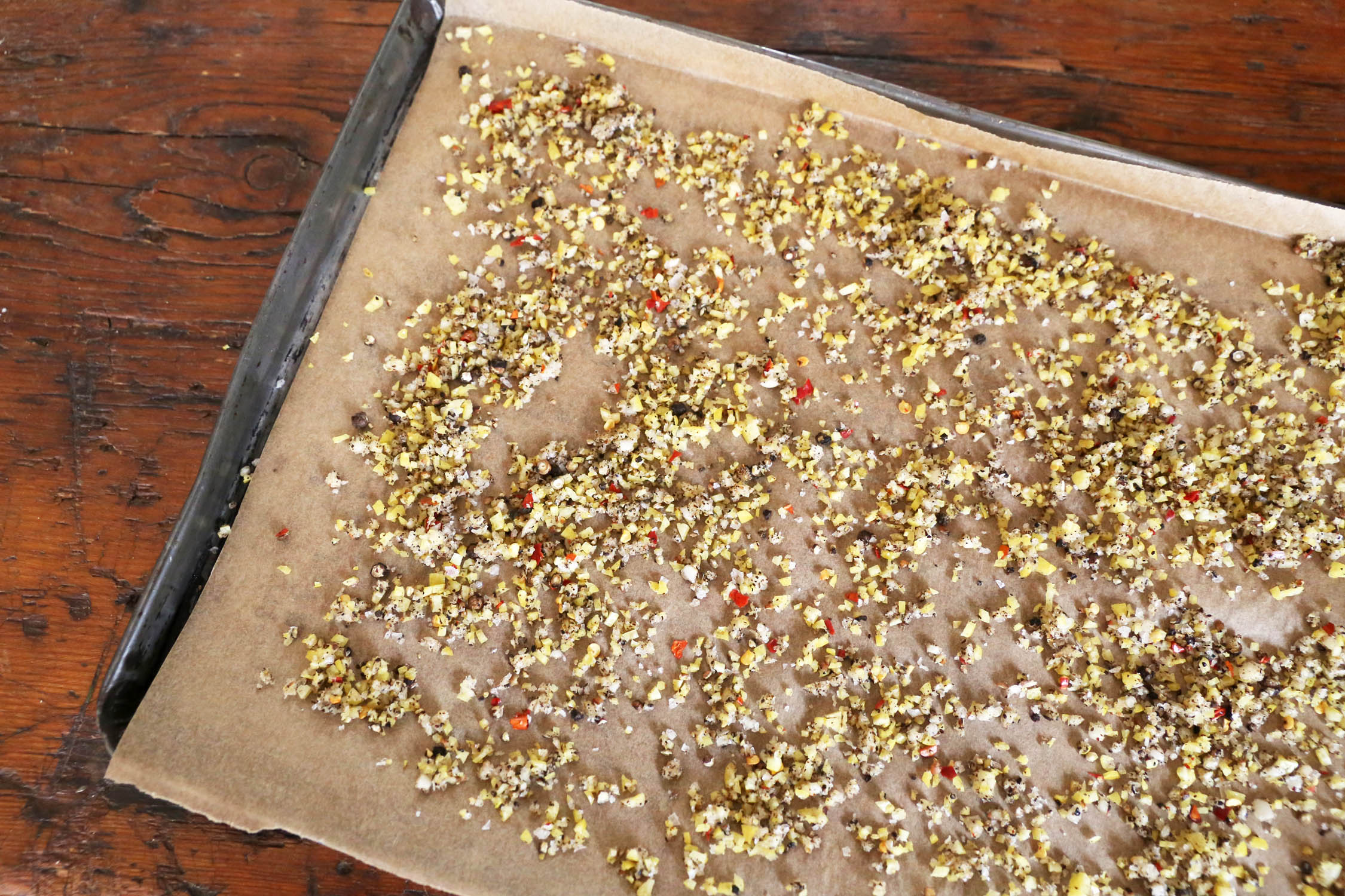 Then sprinkle on a parchment lined cookie sheet and allow it to dry at room temp. for a couple days. This one takes a while to dry out. You can turn your oven on to 170º and once it warms up, turn it off and put your garlic mixture in until it’s dry.
