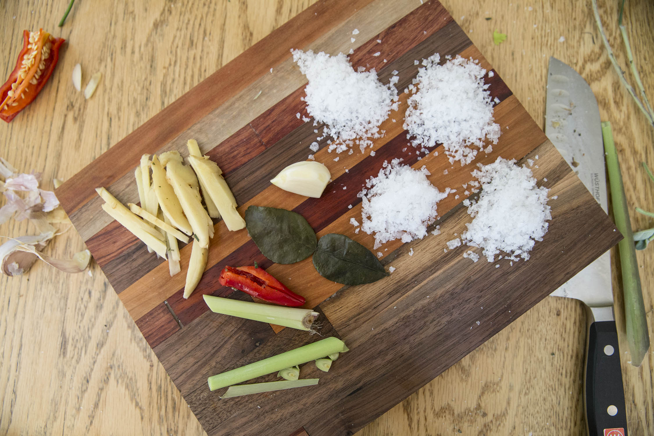 First up is ginger garlic salt. Fresh ginger, garlic, lemon zest, chili pepper and I had lemon grass growing in my garden, so it also joined the party. (Those are kaffir lime leaves, oh so optional.) The photo shows one large garlic clove, but I added two great big, fat ones.