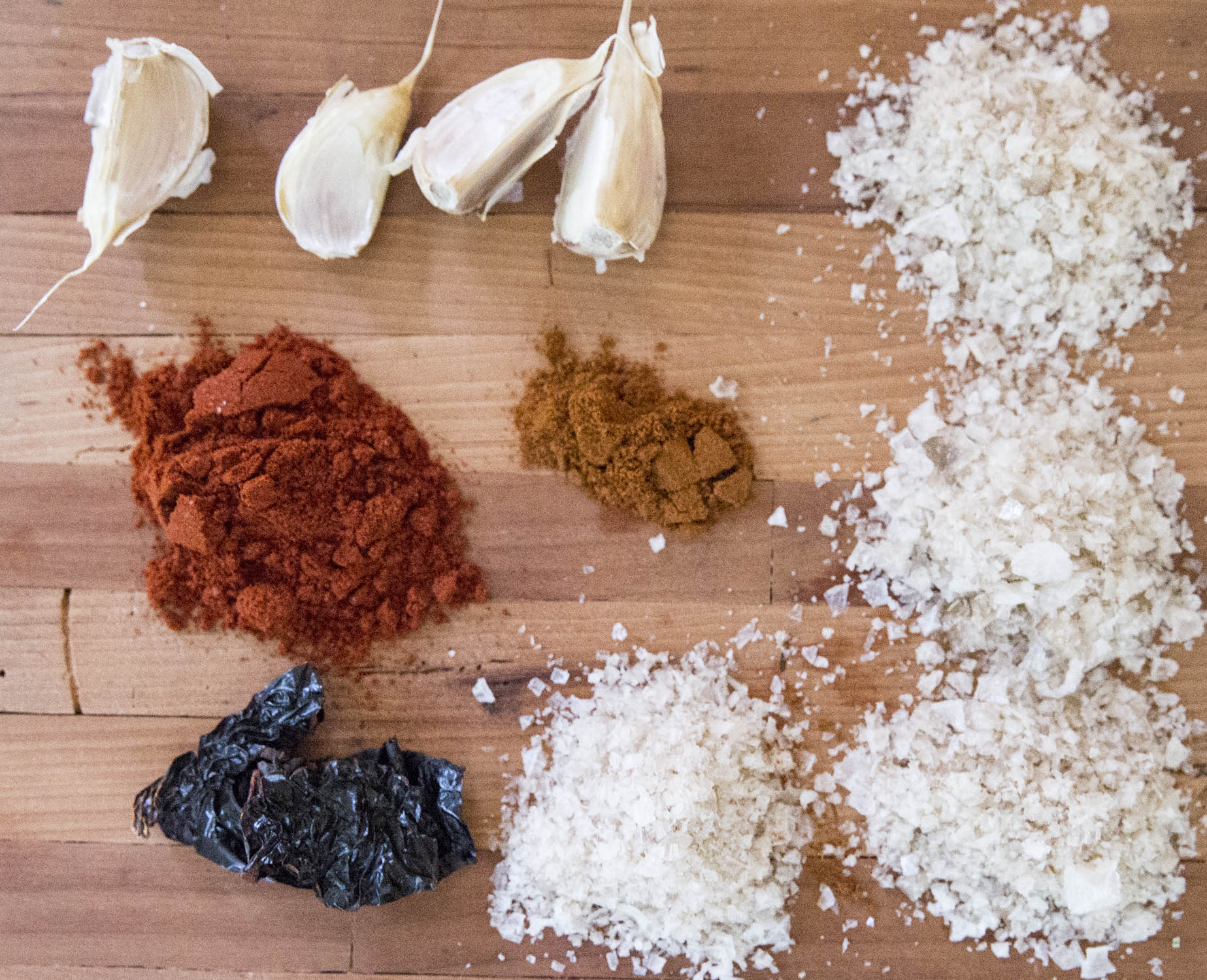 - SMOKY GARLIC SALT: 4 medium cloves garlic, 4 Tbls. coarse salt, 1 Tbs. smoked paprika, 1/2 dried chipotle pepper if you have one or hot chili pepper to taste