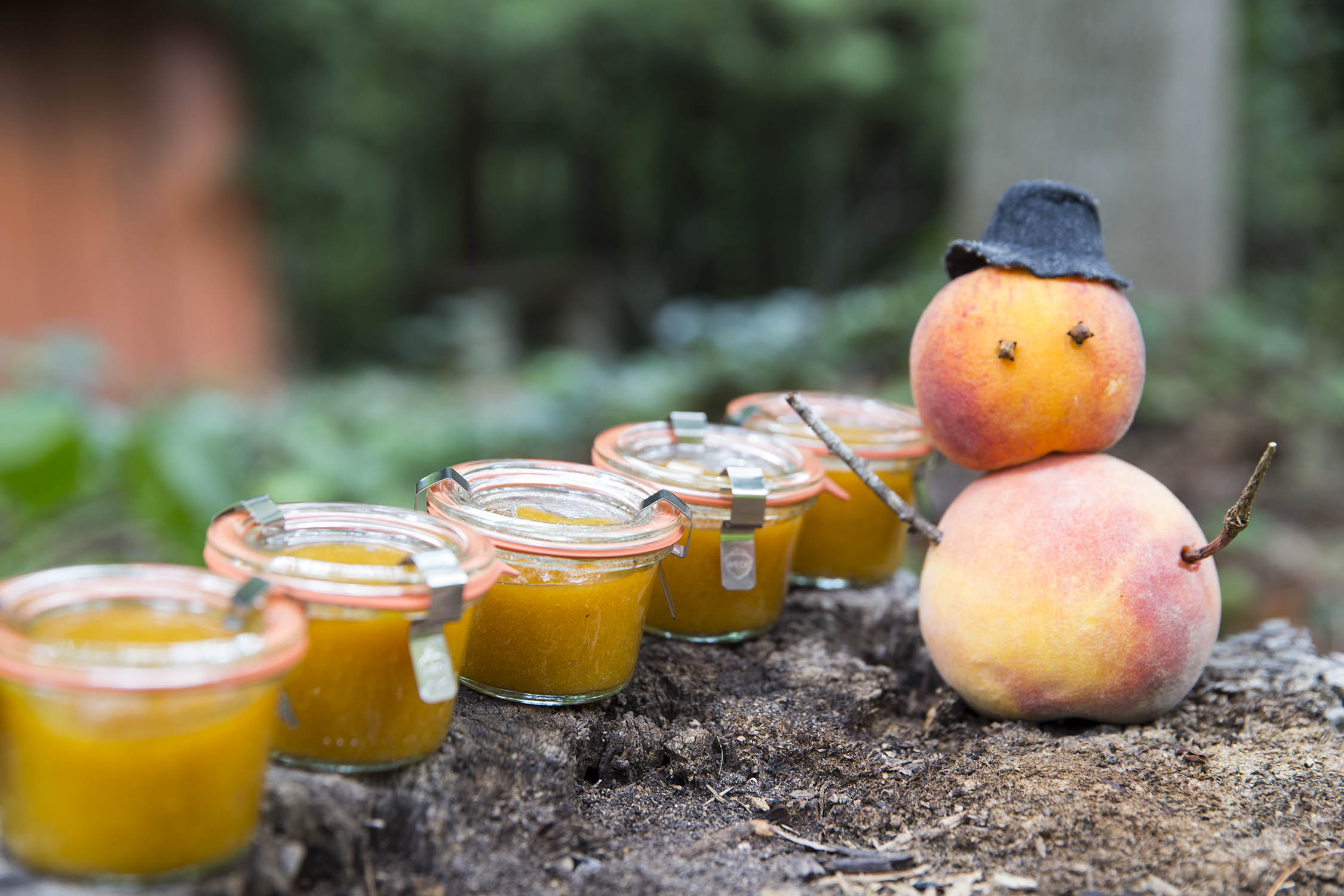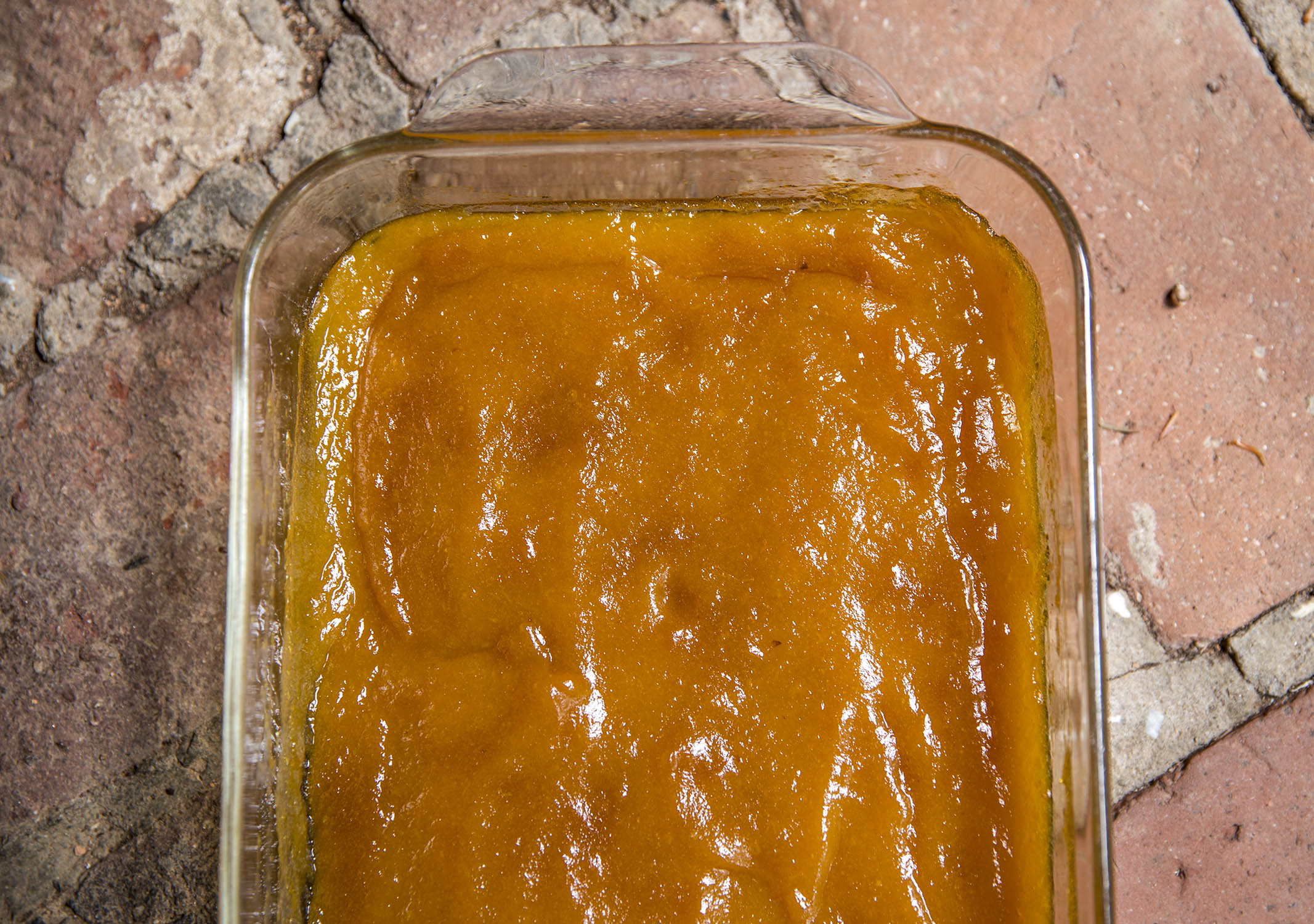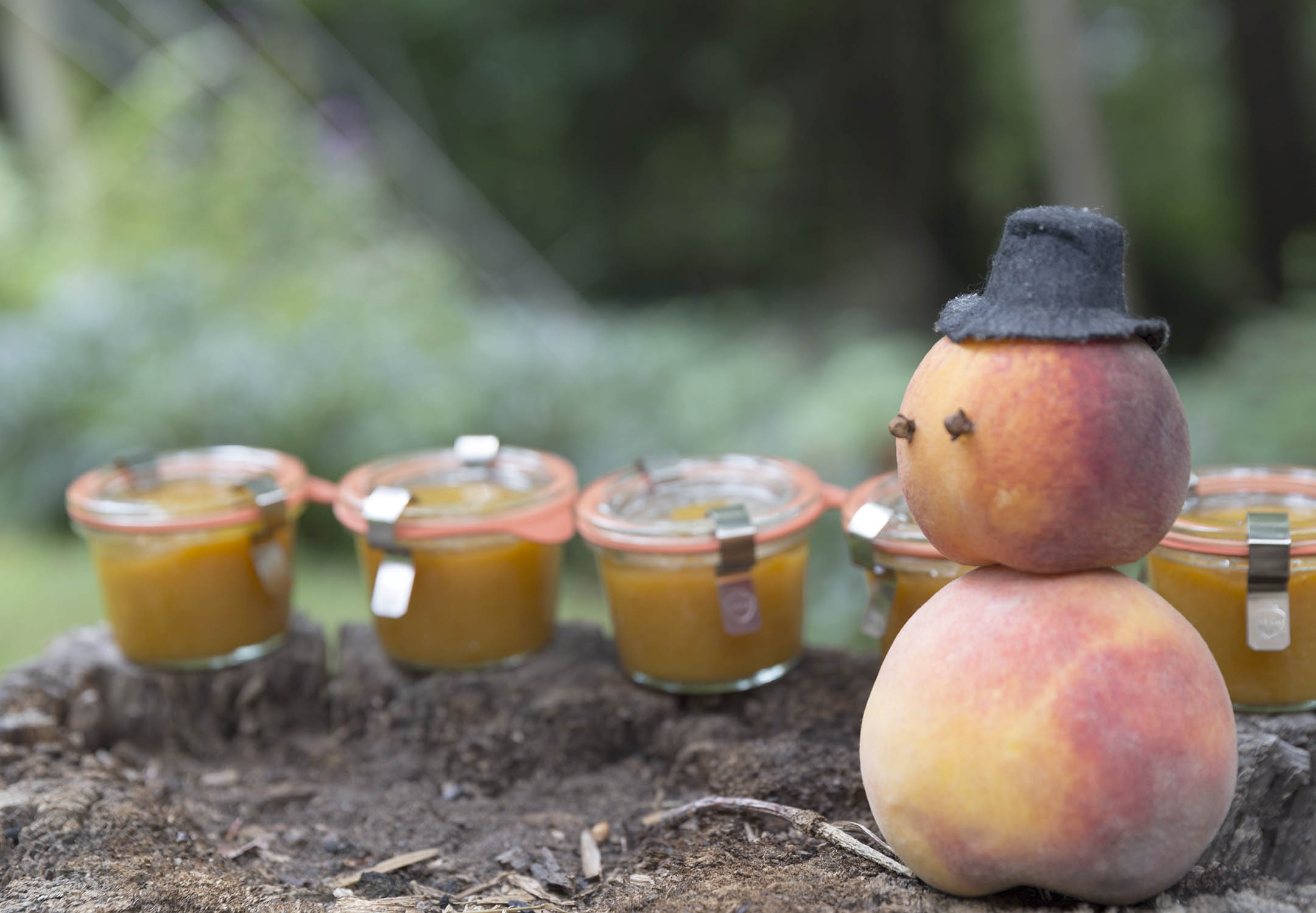 It’s a fine day for a walk in the woods with Mrs. Roasted Peach Butter and her five little “offspring.” Sweet late summer peaches are abundant here in the south, from giant to little and everything in between. They’re ripening on counters, and not-ripening in the fridge and I thought I’d just gather a smattering of varieties and turn them into a fragrant low-added-sugar peach butter spread. Starting with 3 pounds of peaches, I added 1/2 cup sugar (about 100 grams) and juice of a couple lemons. The peaches were so sweet on their own, the modest amount of additional sugar just took over. Bleg. So I took out the stick blender, gave the hot mess a beating and then poured it into a big glass pan to bake in the oven. For an hour at 250º.