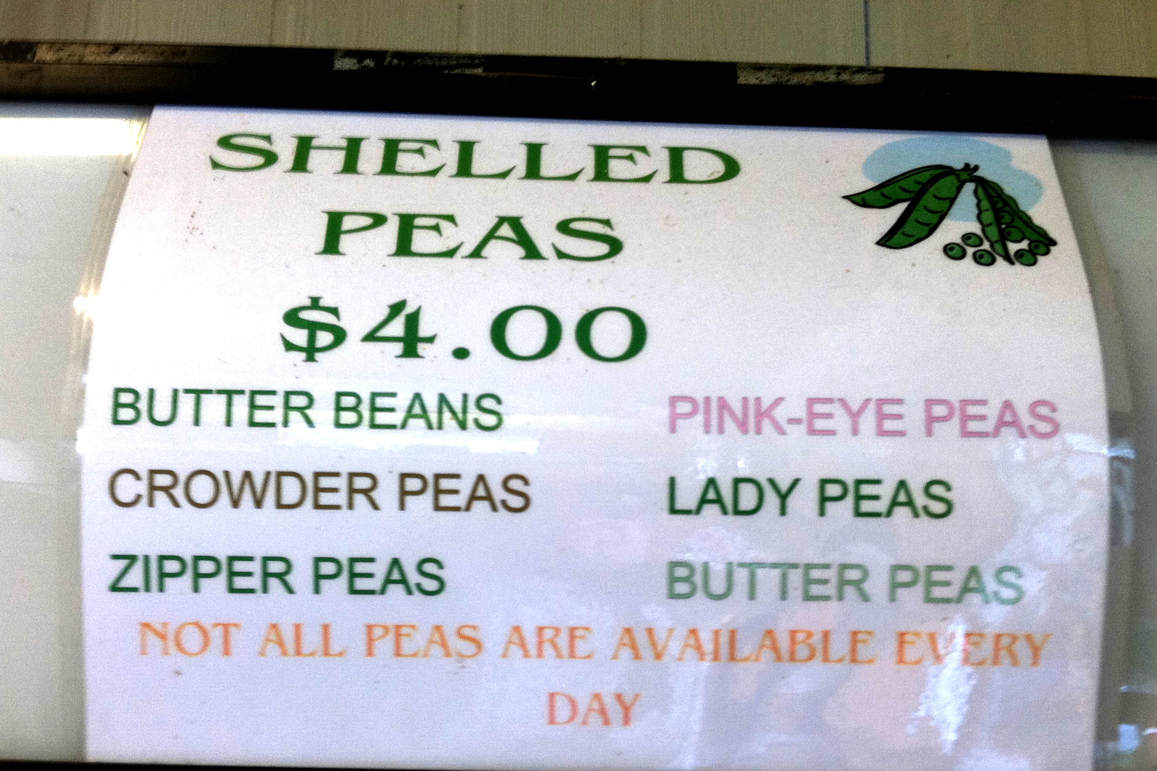 This is not a goat on the roof, but it is a goat. On the right is my nephew, the coolest little kid ever. Anyway, Rita and I ended our sweet visit on Monday by going to the DeKalb international farmer’s market in Atlanta. Holy moly, if you ever get a chance, go there. Food and people from everywhere on earth it seems. I spotted fresh chickpeas and pretty much grabbed all that were left, being as I’ve never had them before. It was the beginning of legume greed. Now I have legume tummy, which I will spare you the details of, but it’s worth it. So here’s my official advice, if you see a shelled peas sign like this at a roadside stand … seize the zipper. I bought 5 pints that were already shelled ($4 is a good deal), but shelling is fun if you get a chance.