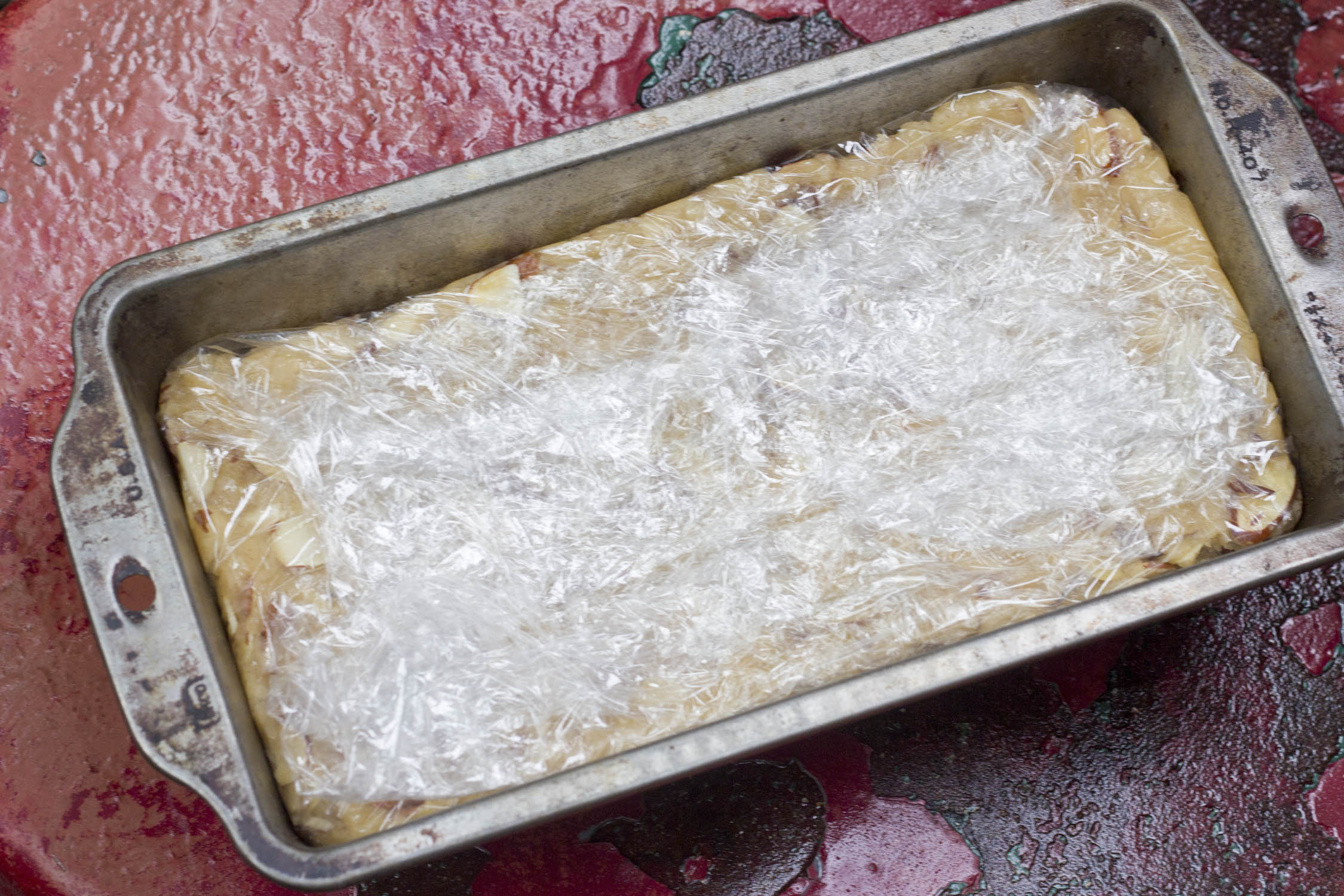 Mix the dough so that it looks like this and then press it into the bread pan that’s been lined with plastic wrap.