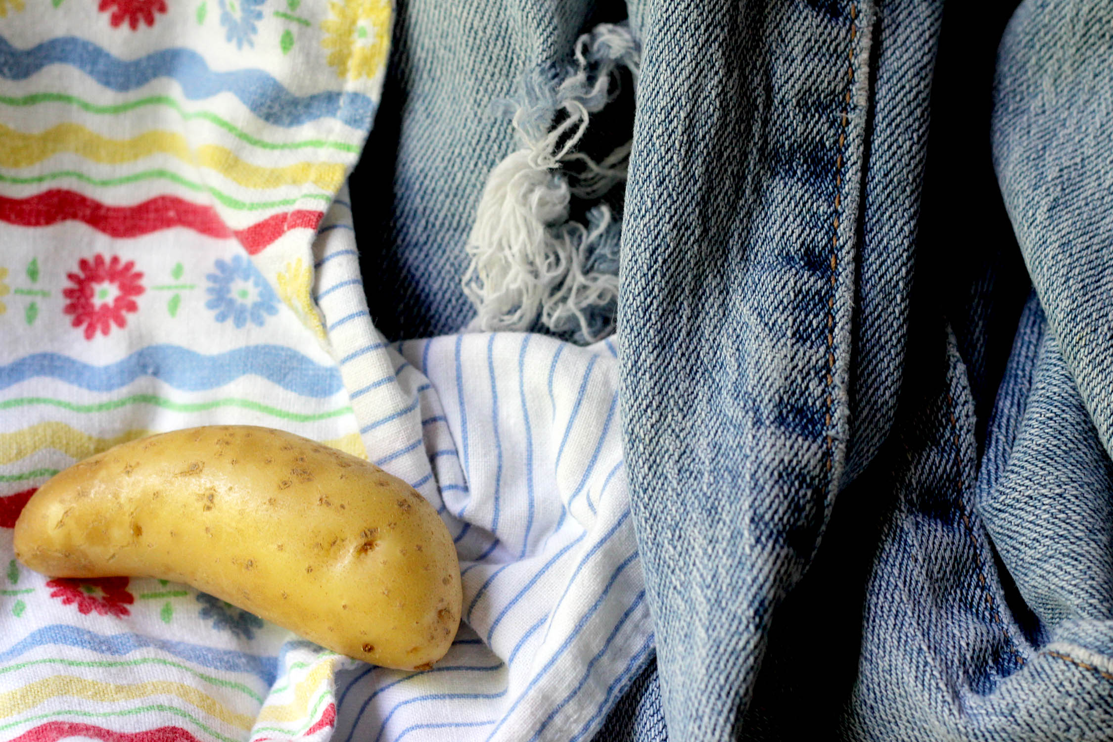 Does this happen to you? You check to see if all the clothes are out of the dryer and you find a potato in there. Normally, I would hang my clothes outside, but it’s been rainy and damp and they just don’t dry all the way so I had to pop them into the dryer to finish up. That’s where the potato comes in. It’s a La Ratte fingerling potato, the kind I grow and the kind I just recently harvested from my garden. (By the way, this is an extremely prolific, fantastic eating and roasting French heirloom potato that grows happily in Western NC.) Maybe it was in the cuff of my farmer overalls, or my pocket? Why would I put a little potato in my pocket? I will tell you one thing, though. A dryer does not cook a potato. But the washer certainly gets it nice and sparkly clean.
